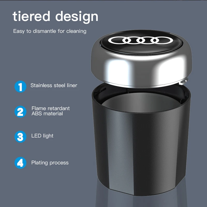Le cendrier intérieur de voiture avec lumière LED est spécialement conçu pour les véhicules Audi tels que l’A1, A2, A3, A4, A5, A7, A8, Q1, Q2, Q3, Q4, Q5, Q6, Q7, Q8, TT, RS3, S5, B8. Fabriqué en ABS ignifuge et en acier inoxydable, ce cendrier de voiture est à la fois durable et élégant.