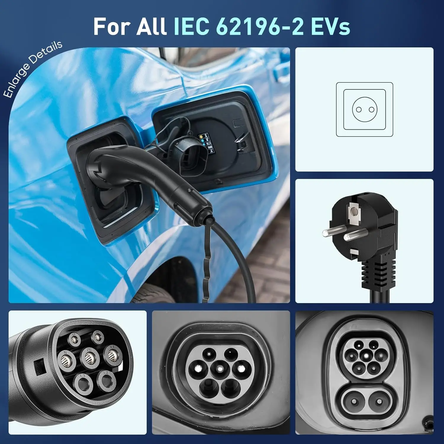 Ce chargeur de voiture électrique est compatible avec la plupart des véhicules électriques (BEV) et des véhicules hybrides rechargeables (PHEV) équipés de connecteurs de type 2 ou CCS2 en Europe. Il est compatible avec de nombreux modèles de véhicules, tels que le 3008, 508, 308 PHEV, C5X, DS7, GLA, Q3, X3, ID.3, ID.4, ID.5, e-Golf, e-Up, Model Y, Model 3, Kona, Ioniq 5, e-tron, ZOE, i3, i4 et d’autres.