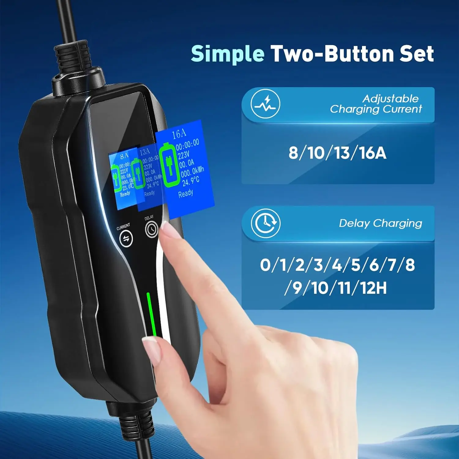 Ce chargeur de type 2 dispose d’une fonction de charge programmable avec un délai de 0 à 12 heures. Vous pouvez facilement programmer la charge en fonction de votre horaire, ce qui vous permet d’optimiser l’utilisation de l’électricité pendant les heures creuses et de réduire vos factures.
