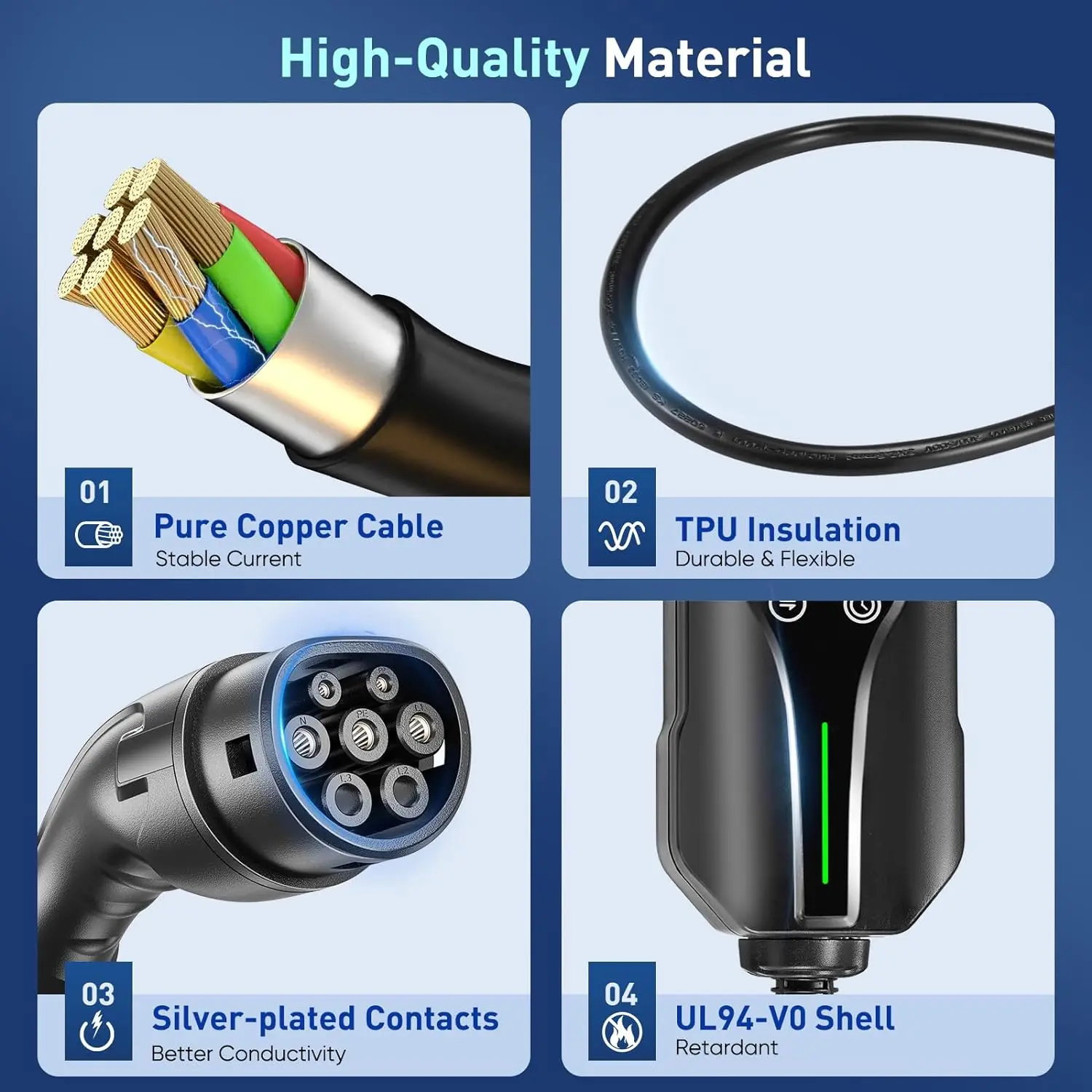 Les câbles de charge de ce chargeur de voiture électrique sont certifiés TÜV, CE et UL, garantissant une qualité et une fiabilité élevées. Le chargeur est doté de nombreuses protections, telles que la protection contre les fuites, les surtensions, les surintensités, la surchauffe et la mise à la terre, pour assurer la sécurité des utilisateurs et des véhicules.