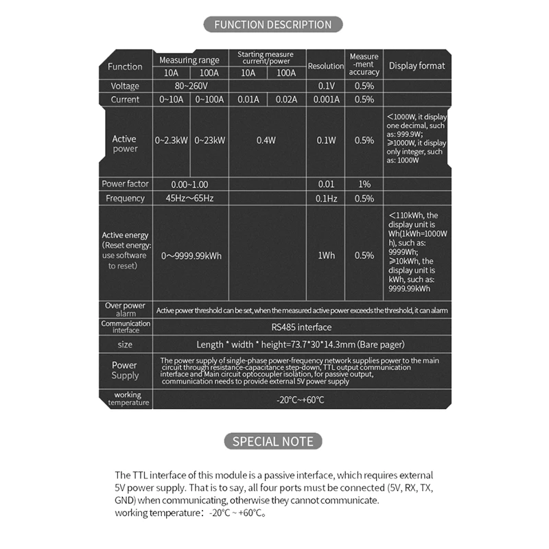 Avec une résolution et une précision de mesure élevées, ce compteur dispose d’une plage de mesure de 10A et utilise une interface TTL pour lire les données.