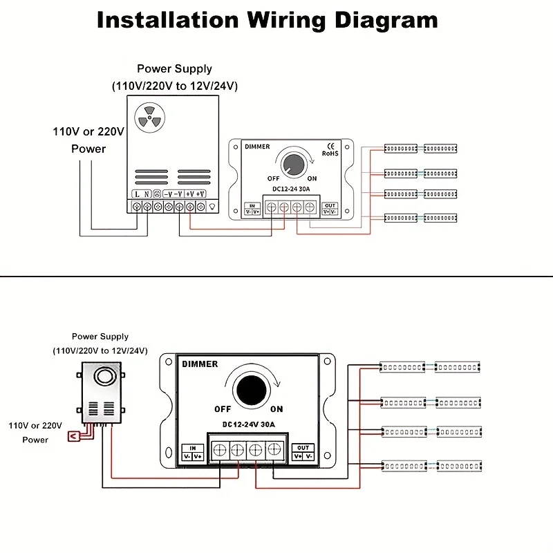 Le DC12-24V 30A Bouton Gradateur Luminosité Réglage Stepless Gradation Commutateur Contrôleur est spécialement conçu pour les bandes lumineuses LED 3528 5050 COB SMD. Ce gradateur vous permet de régler la luminosité de vos bandes lumineuses en continu de 0% à 100%. Il est facile à installer et à utiliser, ce qui en fait un choix idéal pour tous ceux qui veulent ajuster la luminosité de leurs lampes à LED de couleur unique et de leurs bandes LED.