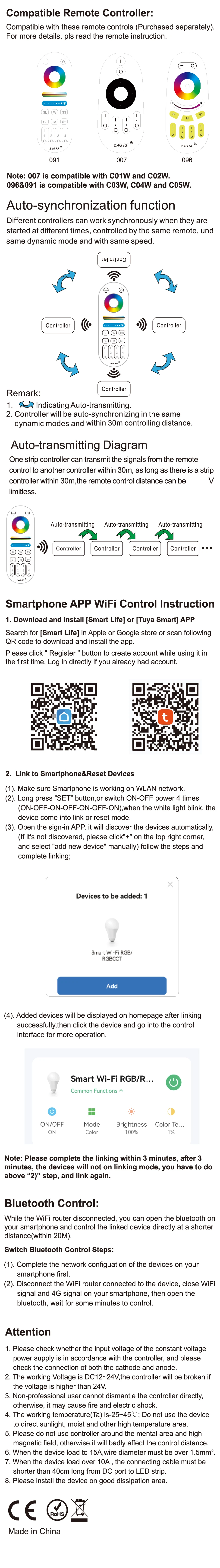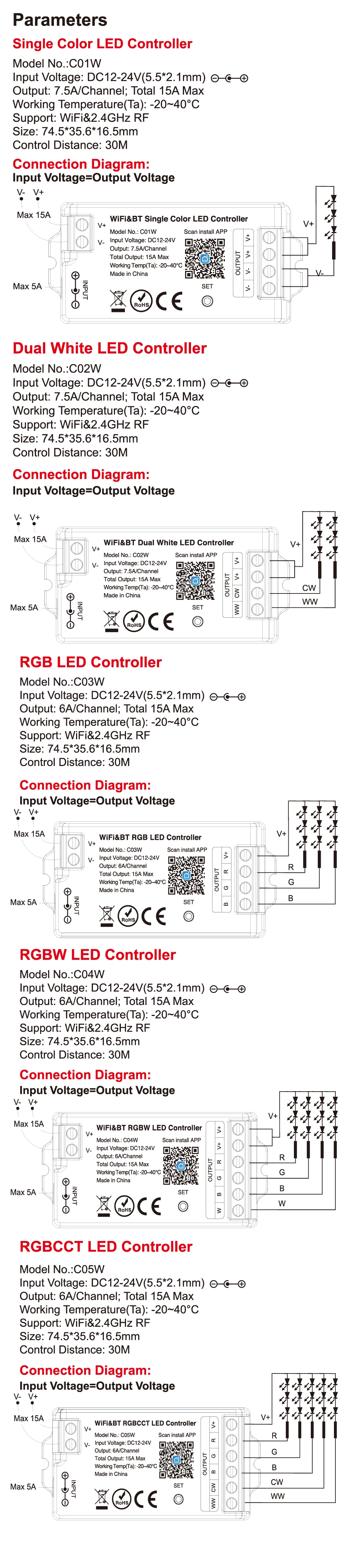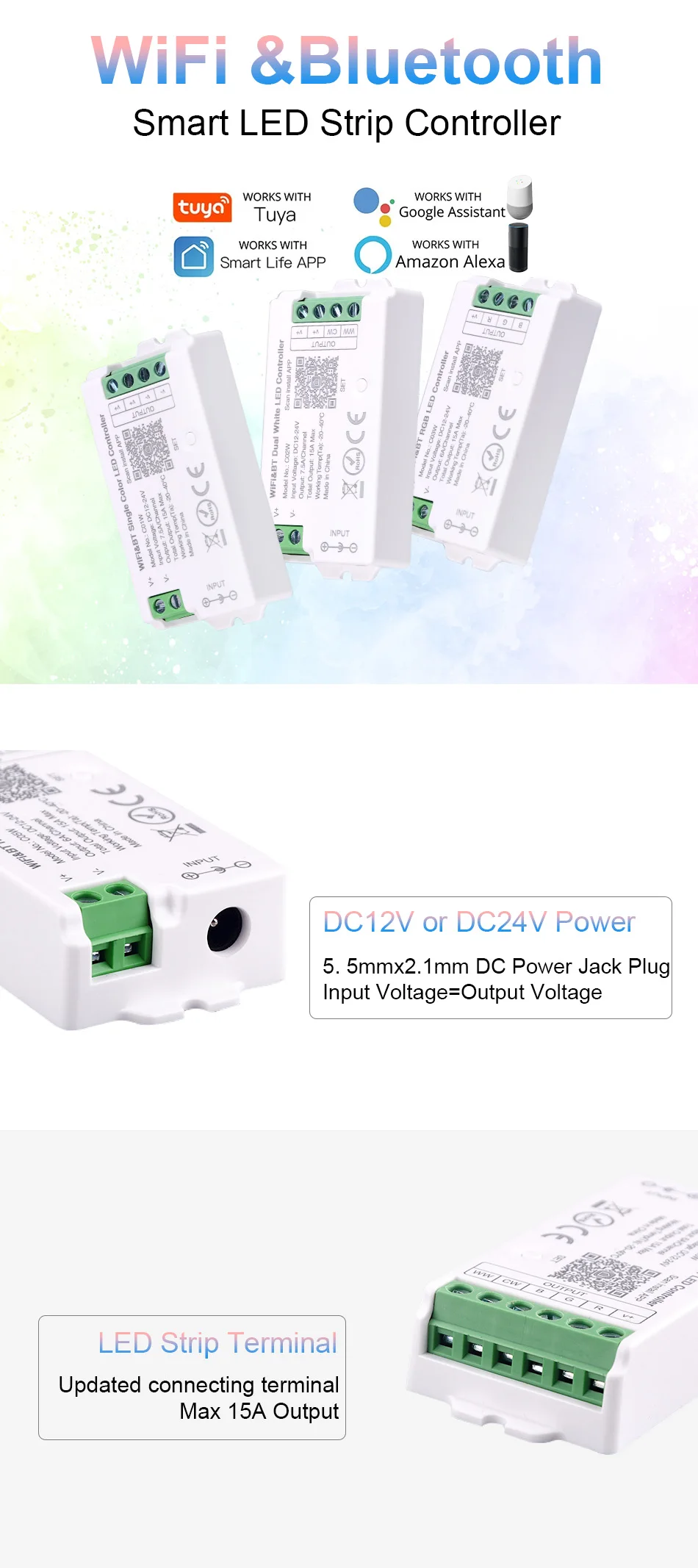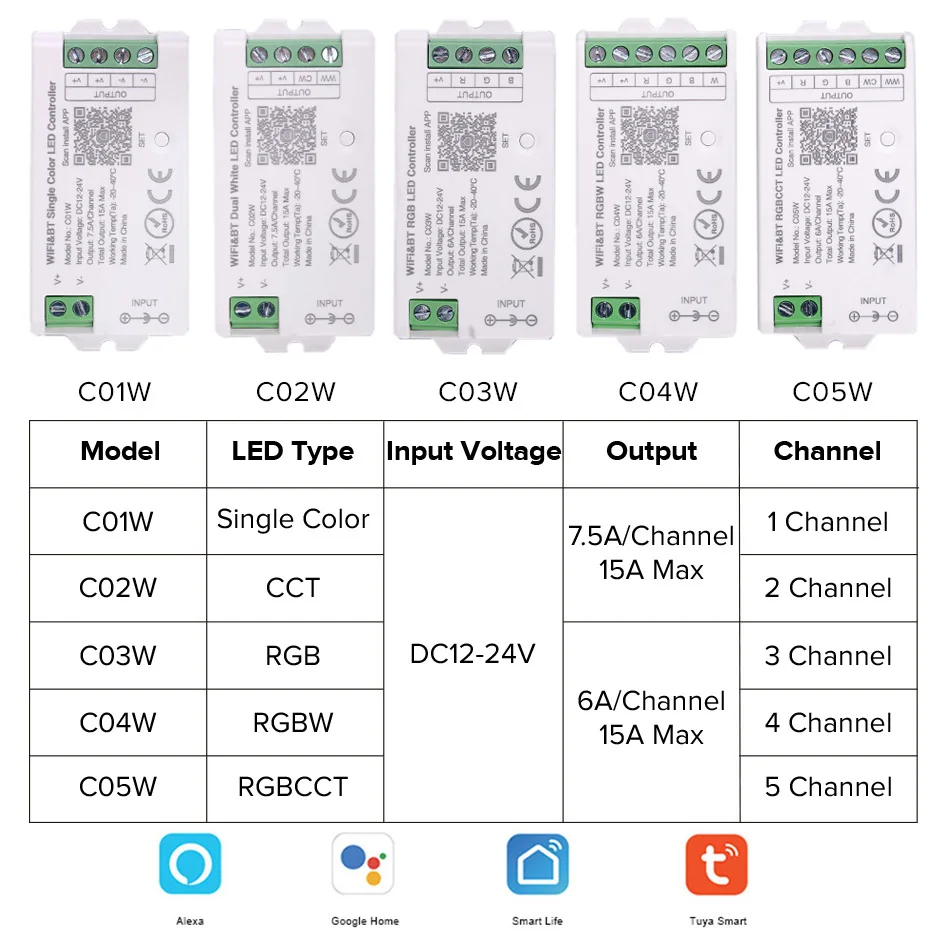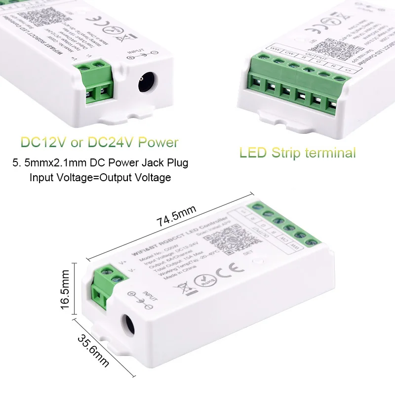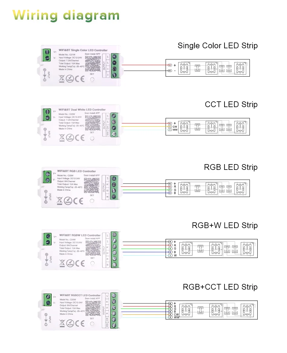 - Compatibilité avec différents types de bande LED (RVB, RGBW, CCT)