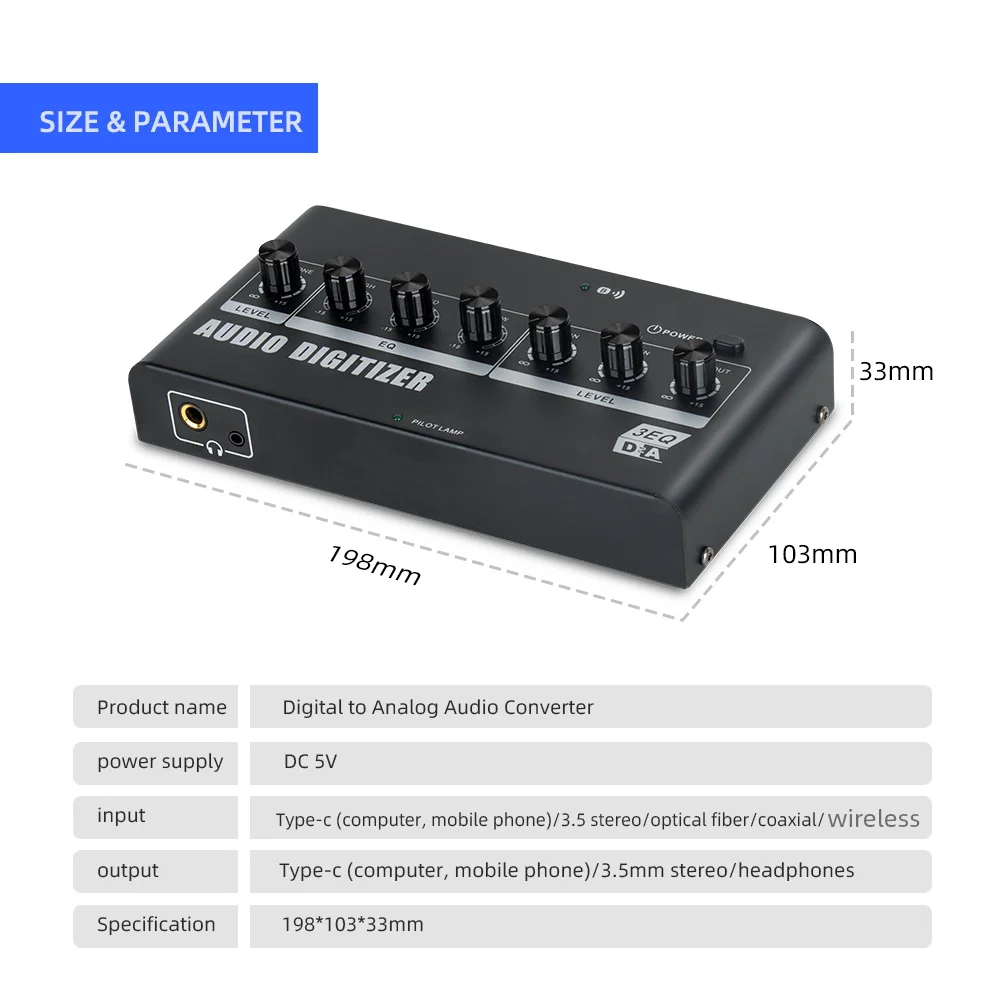 Le convertisseur audio numérique-analogique sans fil est un produit qui permet de convertir un signal audio numérique en signal audio analogique. Il dispose d’une interface RCA coaxiale et d’une entrée USB 3.5mm pour une grande variété de connexions. La sortie stéréo audio analogique 3.5mm permet de connecter des haut-parleurs ou des écouteurs. Le contrôle du volume intégré facilite l’ajustement du volume selon vos préférences.
