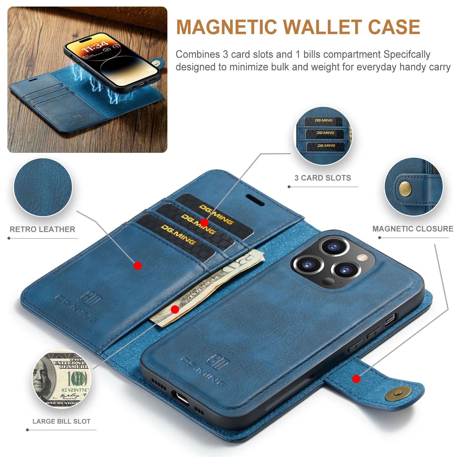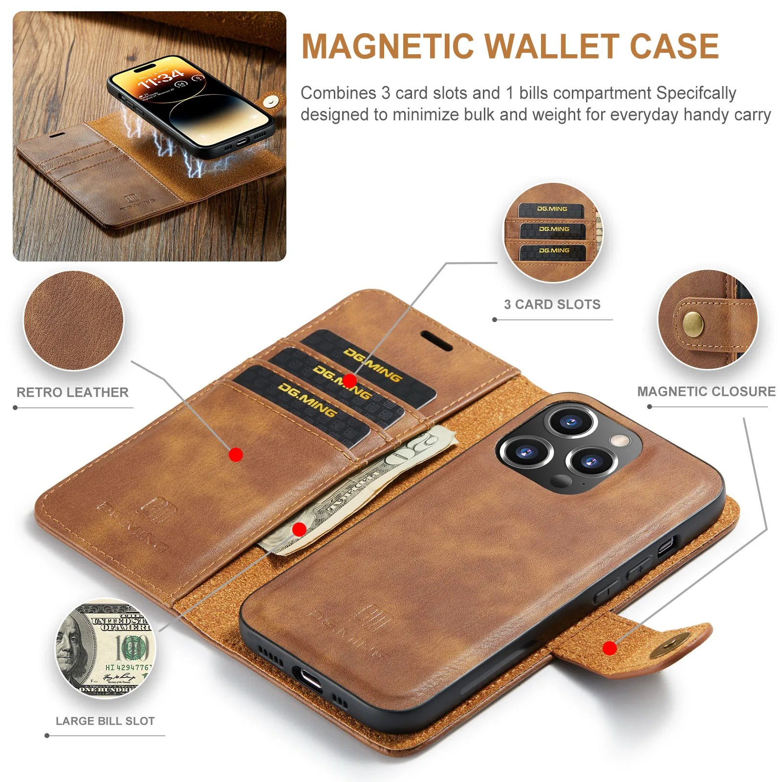 La coque de téléphone magnétique pour iPhone est une coque en cuir à rabat avec un clip de poche pour carte. Elle est compatible avec les modèles d’iPhone suivants : iPhone 15, 14, 13, 12, Mini, 11, Pro, Max, Poly, Xs, Xsmax, 8, 7, 6, Plus, 5, SE 2022.