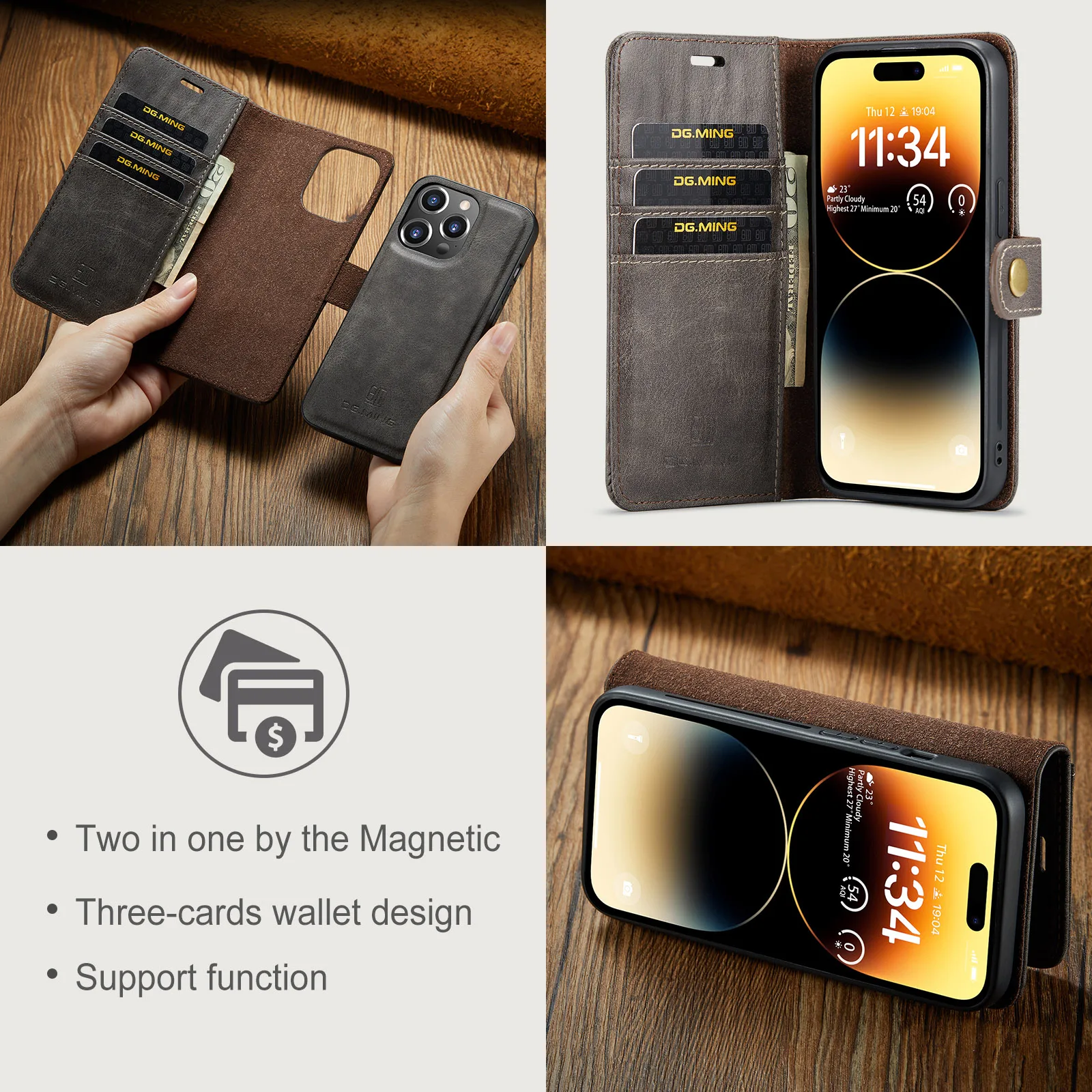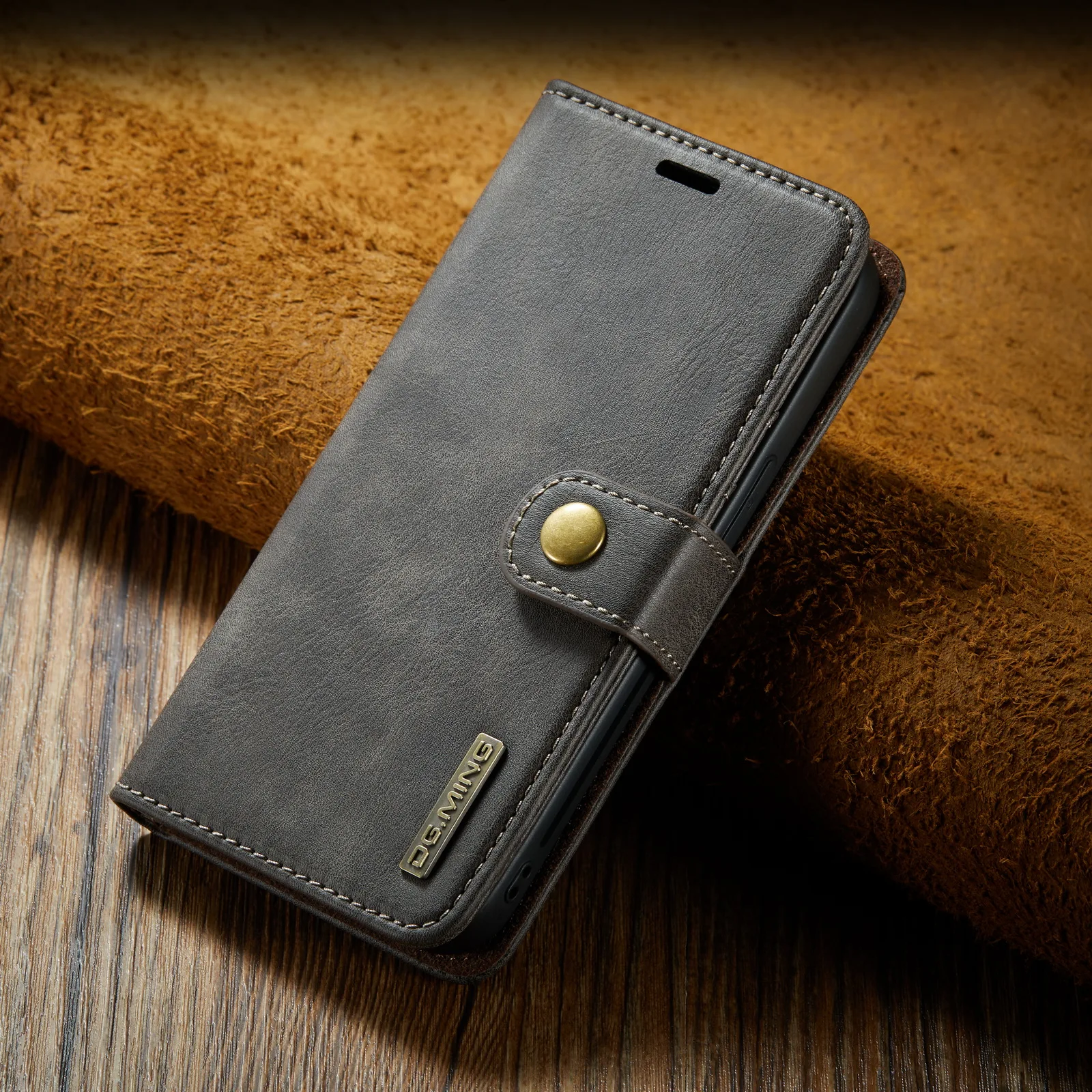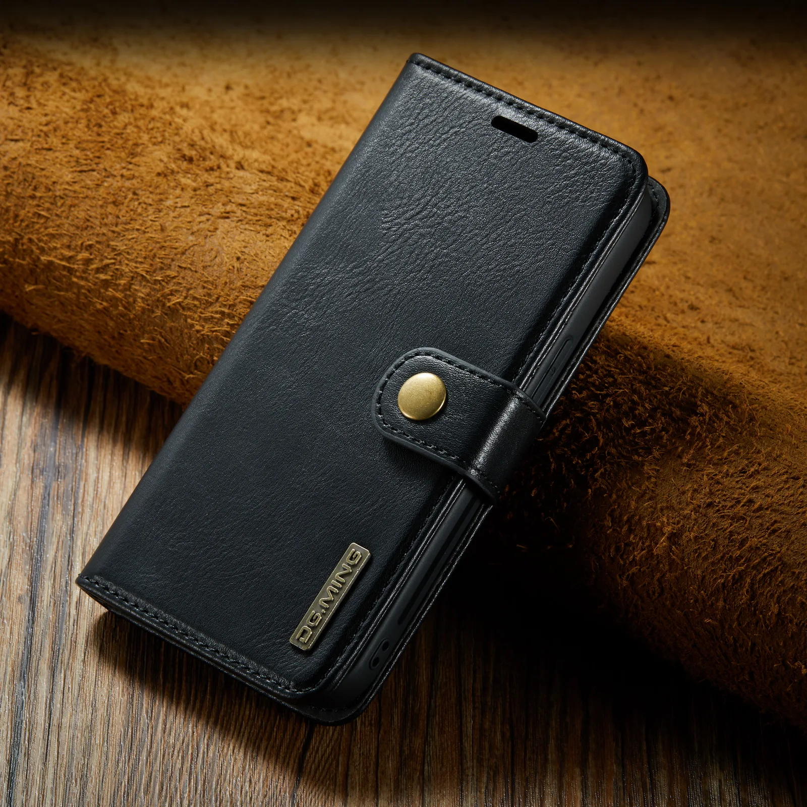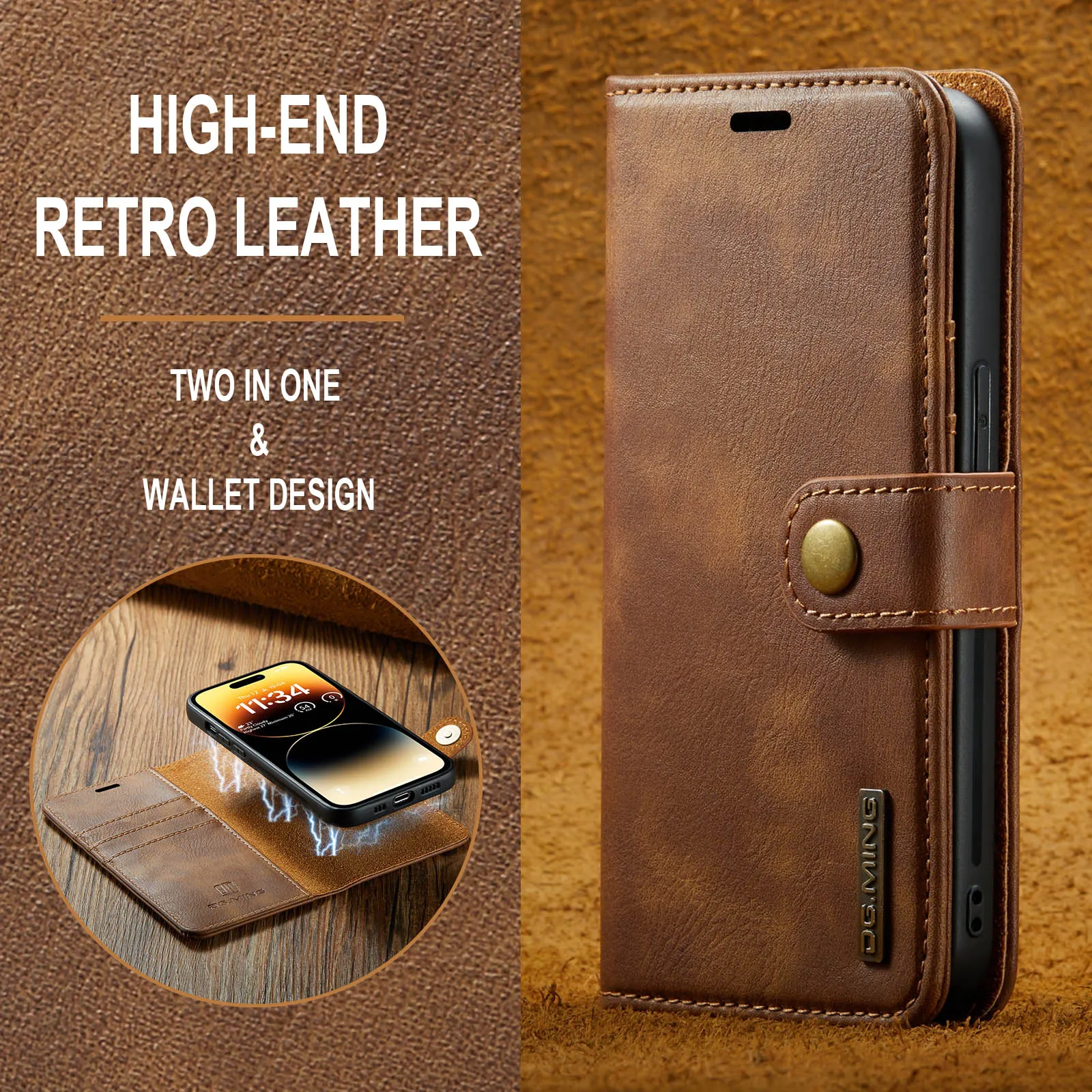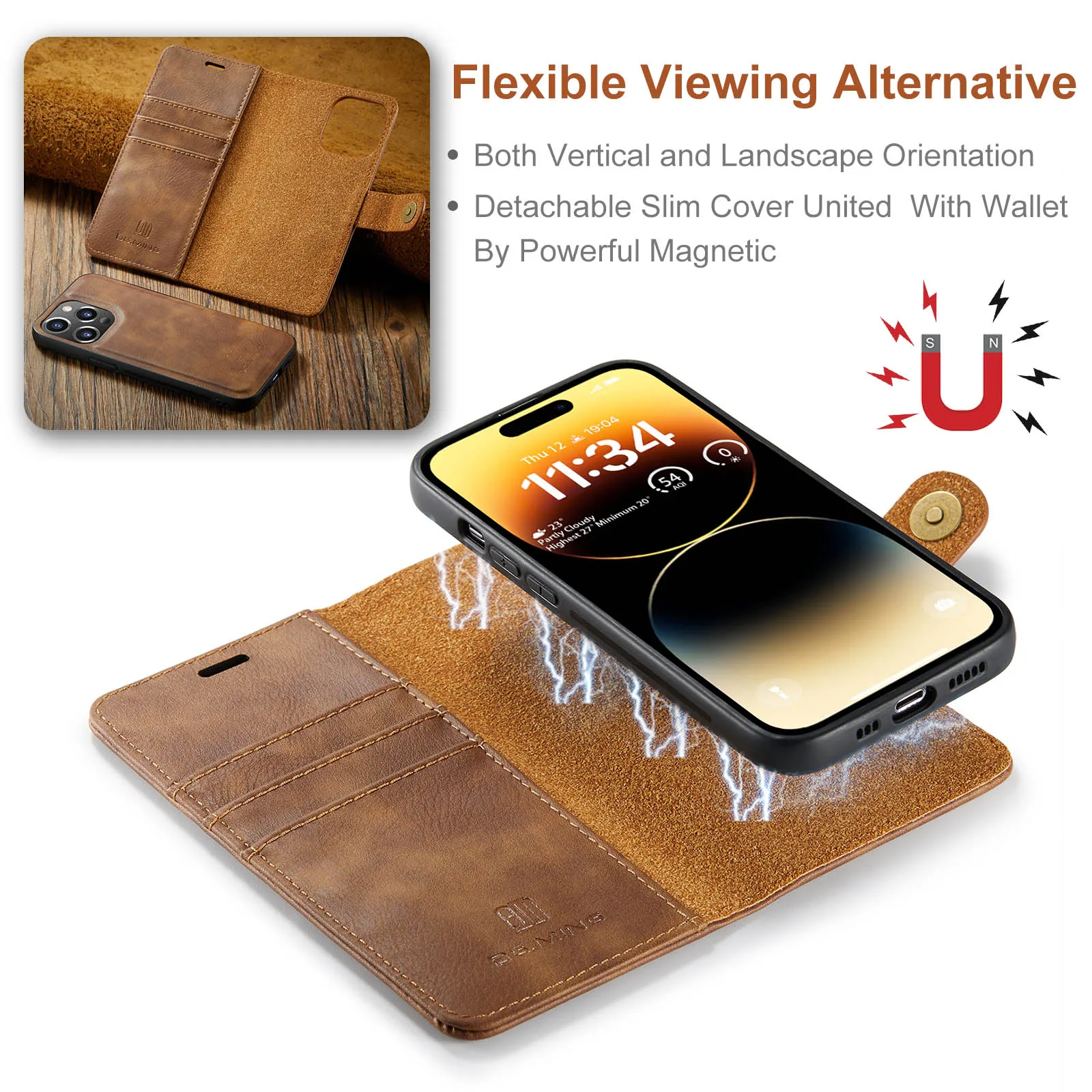- Cuir à rabat : La coque est fabriquée en cuir de haute qualité et dispose d’un rabat pour protéger l’écran de votre iPhone.