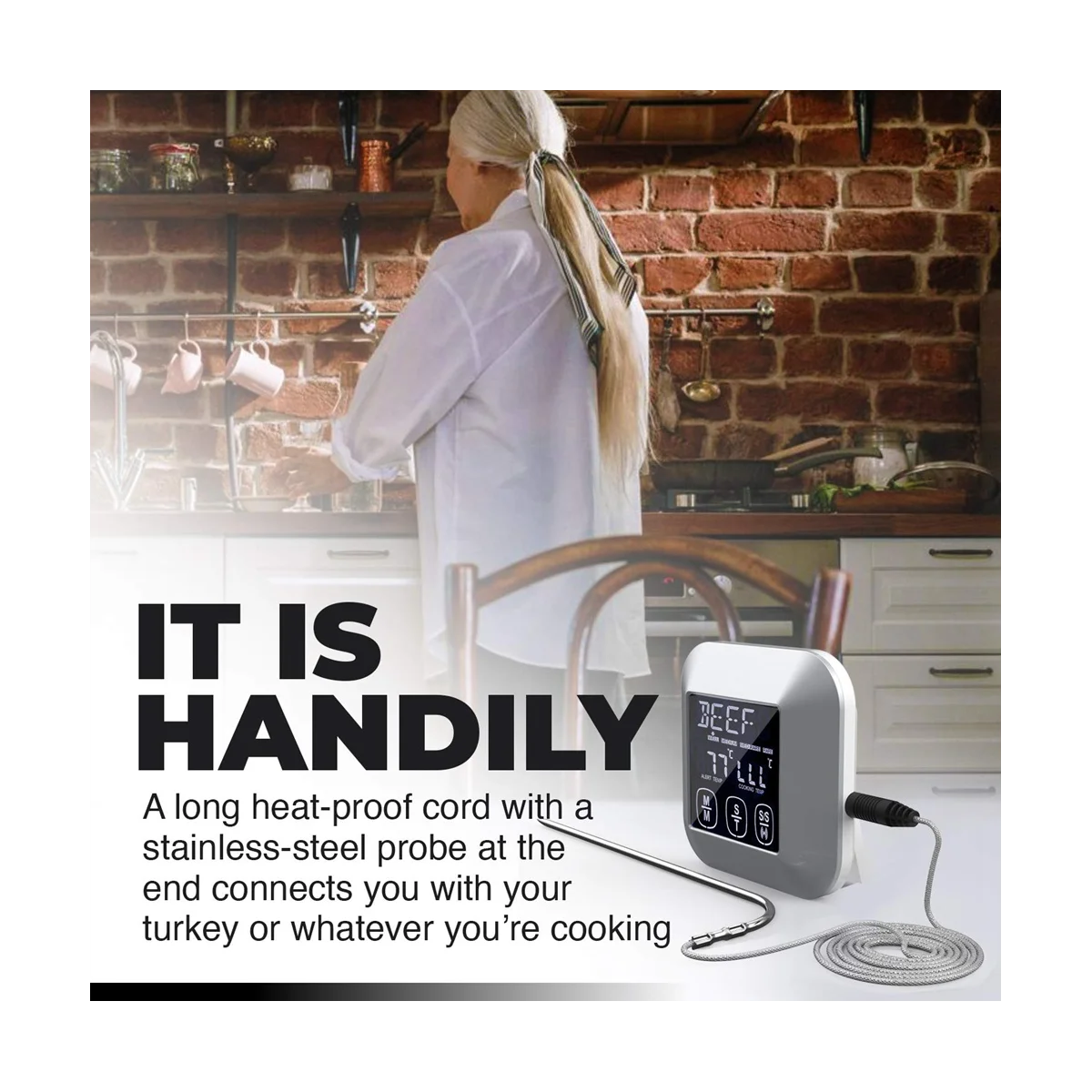 Avec ce thermomètre à viande numérique, vous pouvez être sûr que vous avez cuit votre repas à une certaine température de cuisson. Cela vous assure de manger des aliments sains. Ce thermomètre numérique à lecture instantanée est très précis, que vous testiez une côte de bœuf, le lait pour une pâte à levure ou le mélange de crème anglaise pour une crème glacée maison. Un grand écran rétroéclairé vous montre des lectures précises en degrés Fahrenheit ou Celsius. Il y a un simple bouton à l’arrière pour allumer et éteindre le thermomètre. Le thermomètre vous permet de le coller au four ou vous pouvez simplement le laisser sur le comptoir. Un long cordon résistant à la chaleur avec une sonde en acier inoxydable à l’extrémité vous connecte à votre dinde ou à tout ce que vous cuisinez. Vous obtenez une minuterie afin que vous puissiez aller changer vos vêtements ou vous mêler aux invités sans craindre de manquer l’alerte prête. Ce thermomètre numérique à lecture instantanée prend la température en seulement 2-3 secondes. Il est très précis avec une large plage de mesure de température: 0 °C ~ 250 °C (482 °F). Pas besoin de transpirer sur un gril chaud, obtenez les températures instantanées en quelques secondes. Choix parfait pour BBQ extérieur.