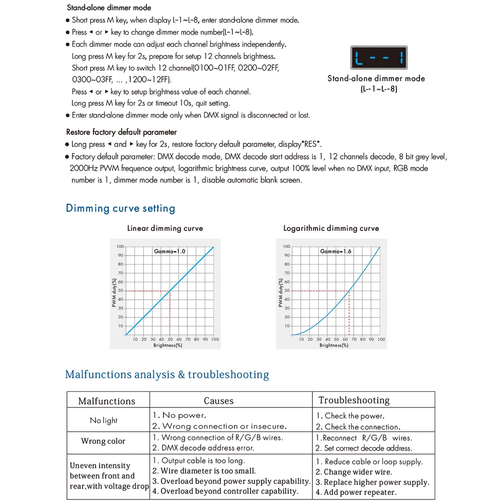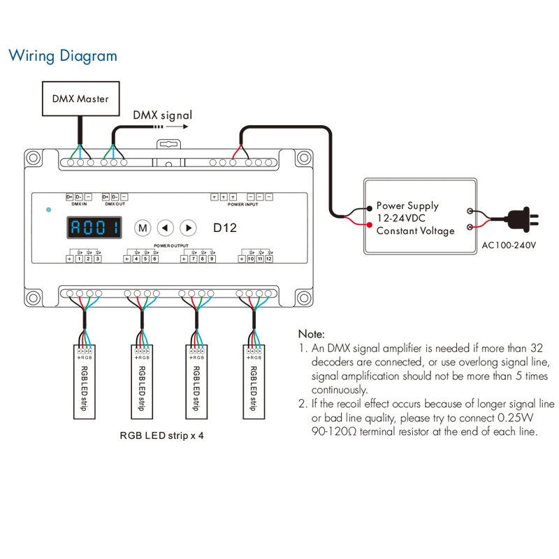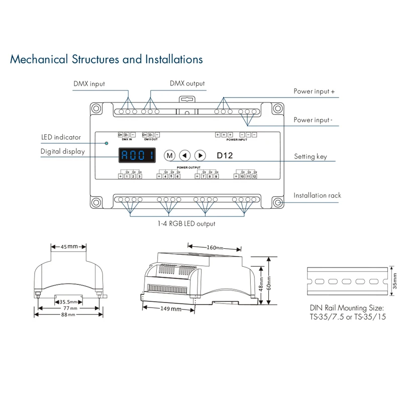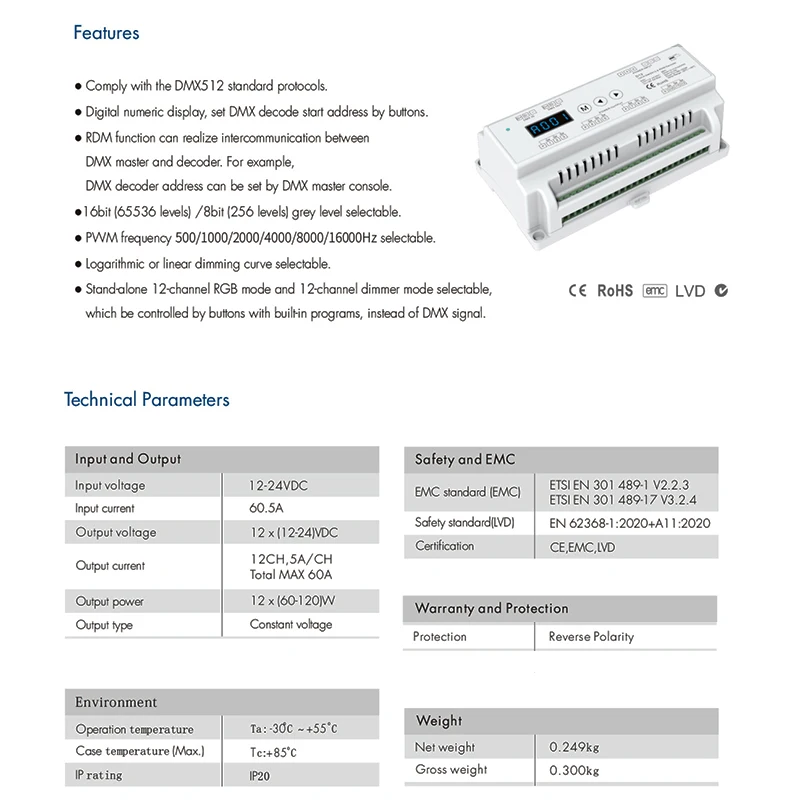 Le décodeur DMX à tension constante, monté sur rail DIN, 12 canaux vous permet de contrôler jusqu’à 12 appareils d’éclairage avec précision. Avec sa fonction CV et PWM, vous pouvez utiliser ce décodeur pour différents types d’éclairage.
