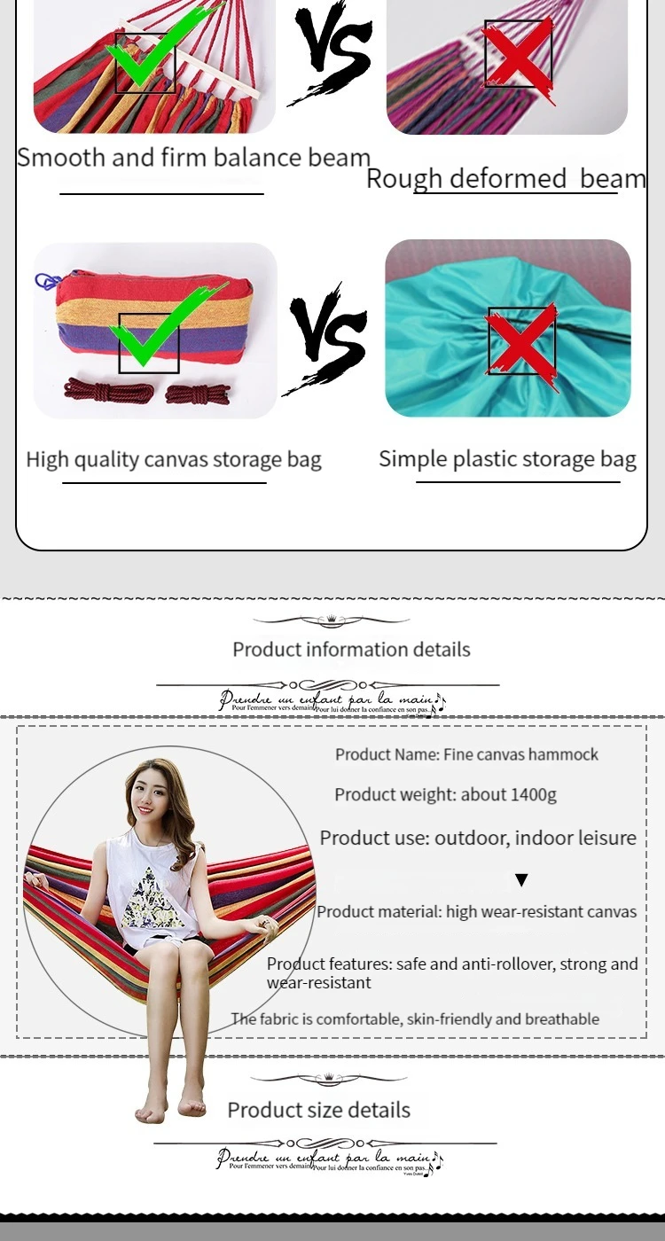 Il s’agit d’un hamac d’extérieur, pratique à utiliser et facile à installer, la qualité du tissu est supérieure aux matériaux sur le marché, la grande taille peut être utilisée par différentes personnes, alors choisissez-le pour vous aider à passer un agréable moment en plein air, 3 personnes disponibles Après-midi, soleil, brise, souvenirs d’enfance reviennent.