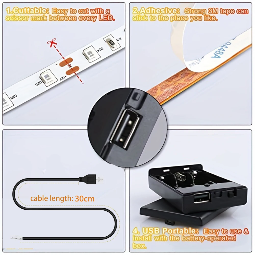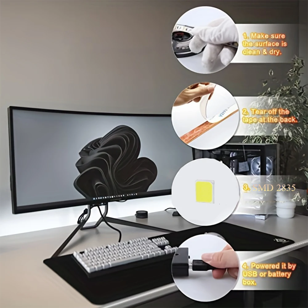 Cette bande lumineuse est alimentée par tous les appareils dotés d’un port USB 5V, tels que les ordinateurs, les ordinateurs portables, les tablettes ou les allume-cigares de voiture. Elle est respectueuse de l’environnement, ne produit aucun rayonnement ni scintillement et n’est pas nocive pour les yeux.
