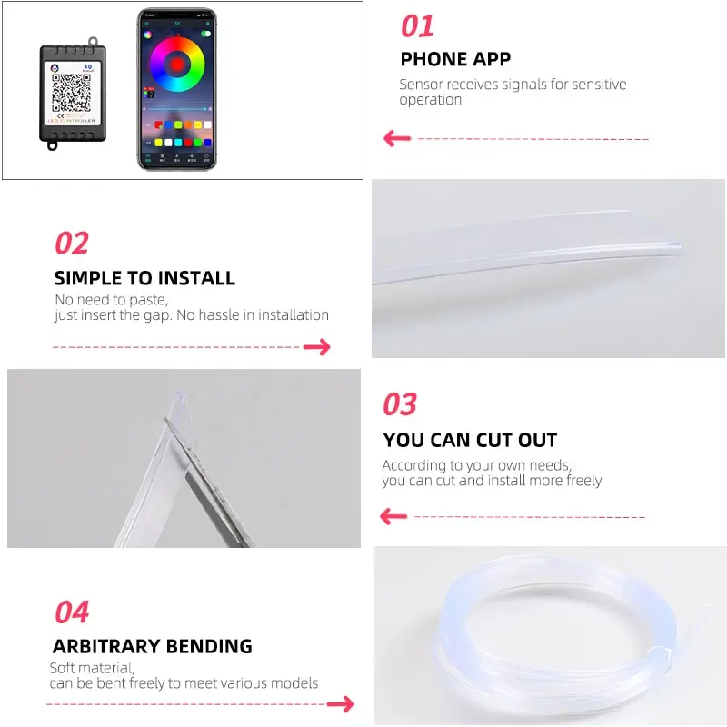 Voici les points importants à retenir concernant la lumière ambiante RVB universelle pour voiture, lumière LED intérieure, fibre optique, contrôle de la musique, lampe au néon décorative automatique :