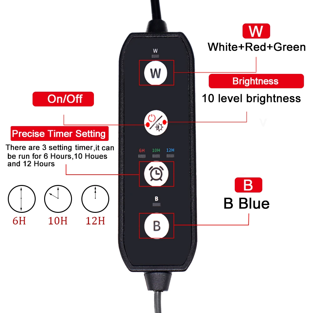 3 réglages au choix, y compris une minuterie intégrée pour programmer l’allumage pendant 6, 10 ou 12 heures, 10 niveaux de luminosité et 3 modes d’éclairage (blanc/bleu/rouge/vert, blanc/rouge/vert ou seulement bleu).
