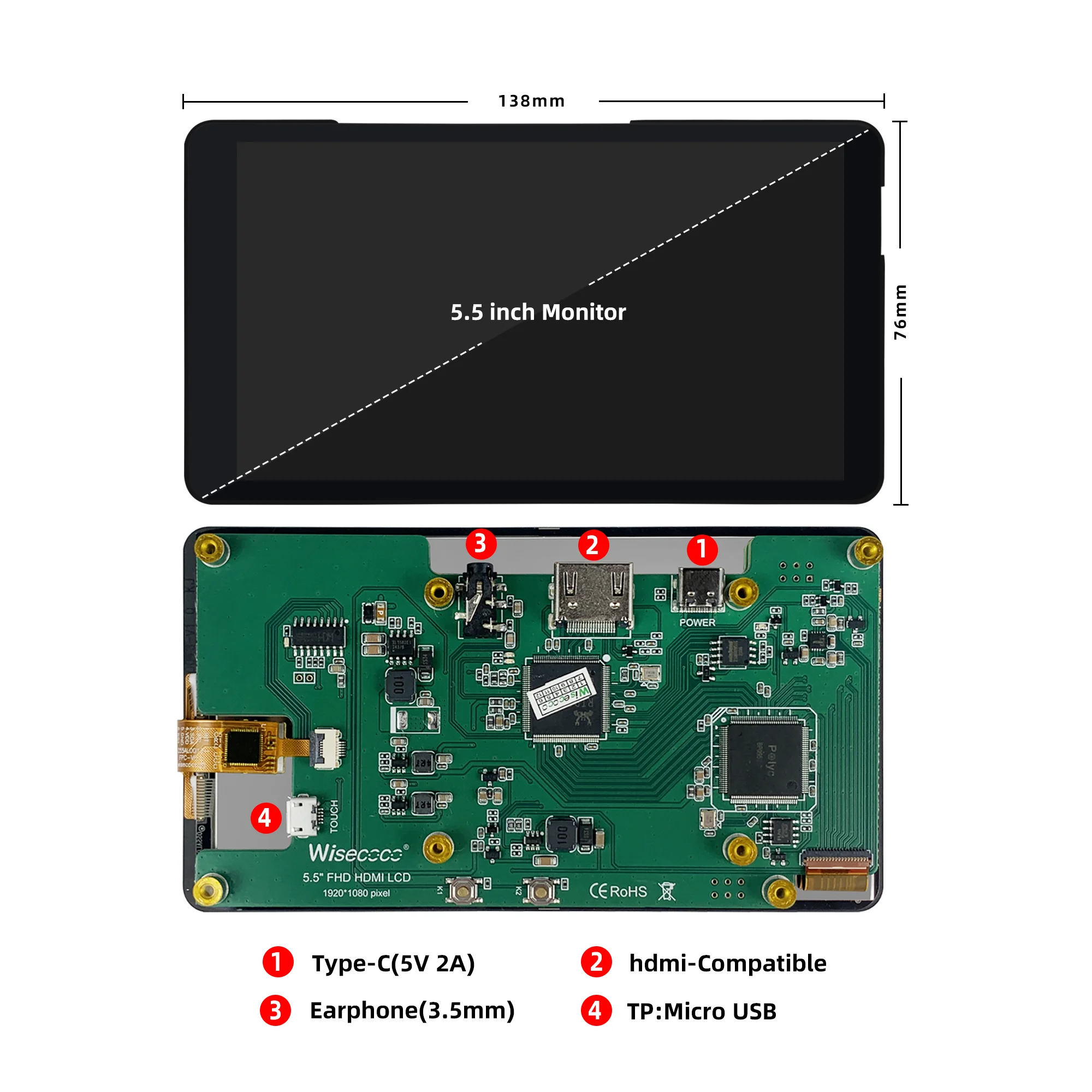 Ce moniteur portable Wisecoco offre une résolution Full HD de 1920×1080, avec un panneau IPS offrant un angle de vue de 178 degrés. La luminosité de 450 cd/m² et le contraste de 1000:1 garantissent une qualité d’image exceptionnelle.