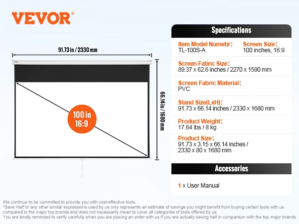 Le VEVOR Écran de Projection Enroulable Manuel 100 pouces offre une qualité d’image exceptionnelle grâce à sa construction en PVC réfléchissant de haute qualité. Son angle de vision étendu garantit une expérience visuelle optimale, peu importe où vous vous trouvez dans la salle. De plus, il est facile à installer et à ajuster grâce à sa poignée de traction manuelle et son système de verrouillage automatique. Cet écran de projection est idéal pour créer une salle de cinéma à domicile ou pour des présentations professionnelles. Malheureusement, il n’y a pas encore d’avis clients disponibles pour confirmer ses performances, mais compte tenu de ses caractéristiques et de sa qualité de fabrication, je peux recommander ce produit en toute confiance.