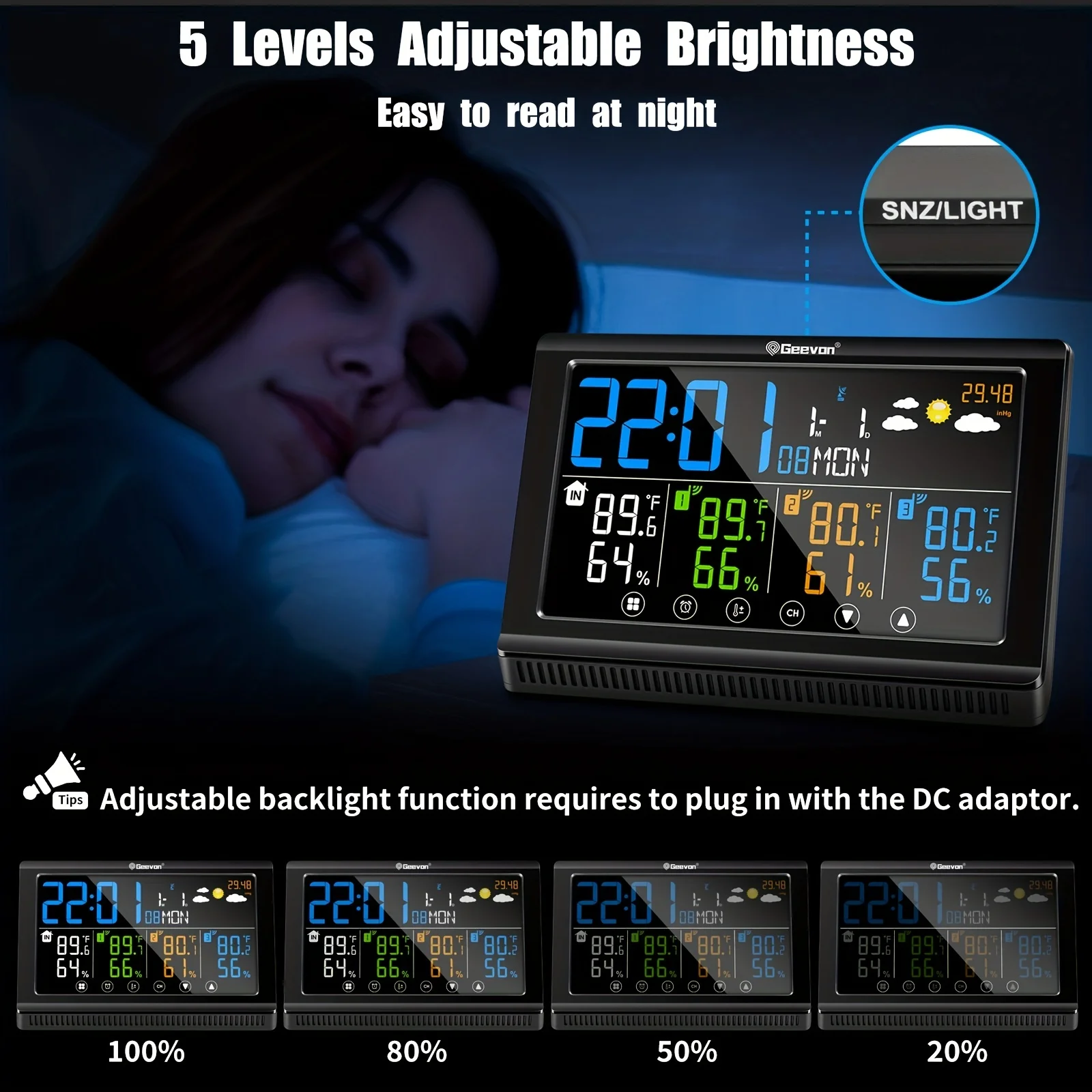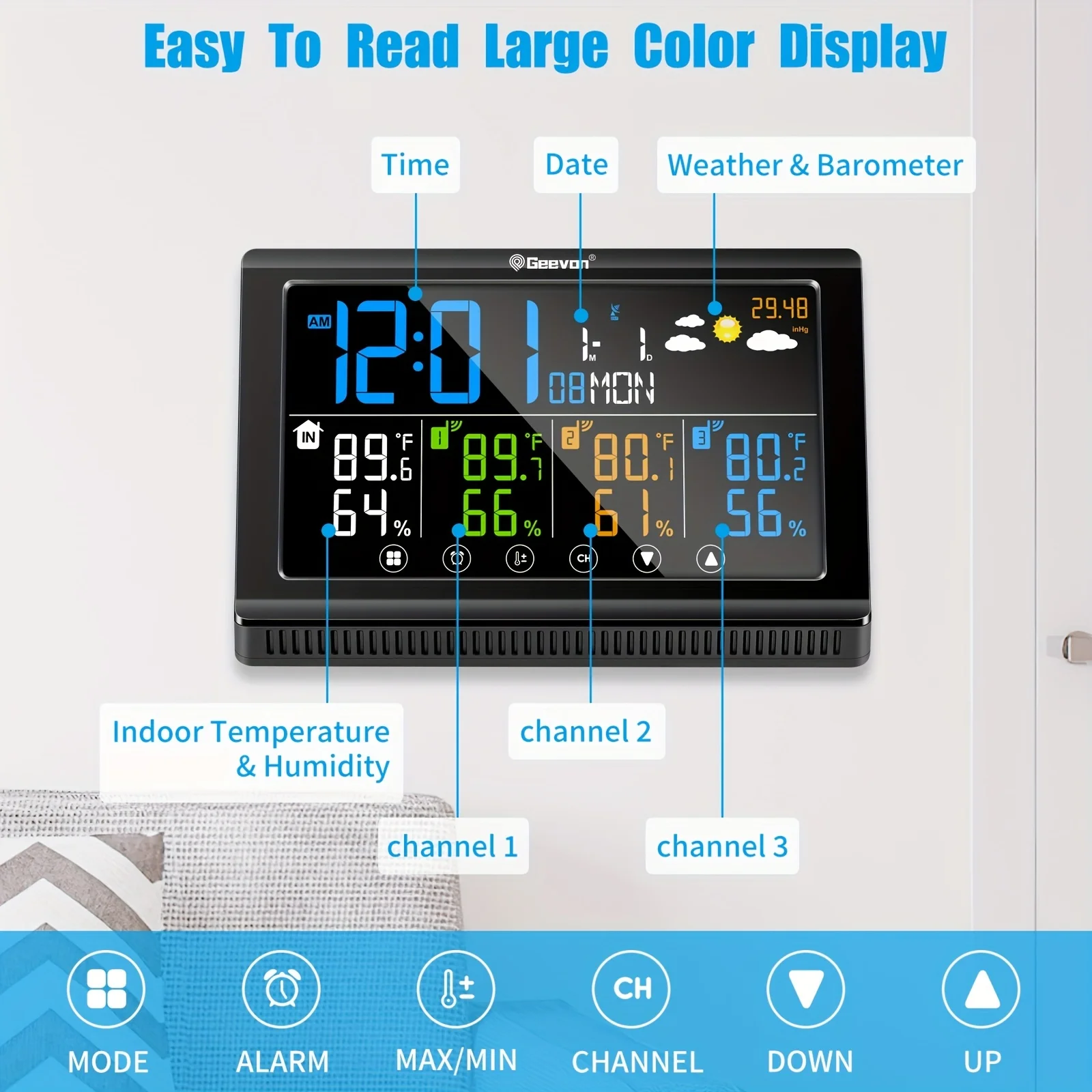 Le thermomètre météorologique intérieur et extérieur avec grand écran tactile LCD fournit presque toutes les informations météorologiques dont vous avez besoin: température et humidité intérieures/extérieures à 4 canaux, prévisions météorologiques futures et pression barométrique réglables, enregistrements Max & Min, réveil atomique, date et heure, charge USB, etc. Notre station météo vous aide à surveiller les conditions environnementales dans votre maison et à créer une vie plus confortable pour vous et vos familles.