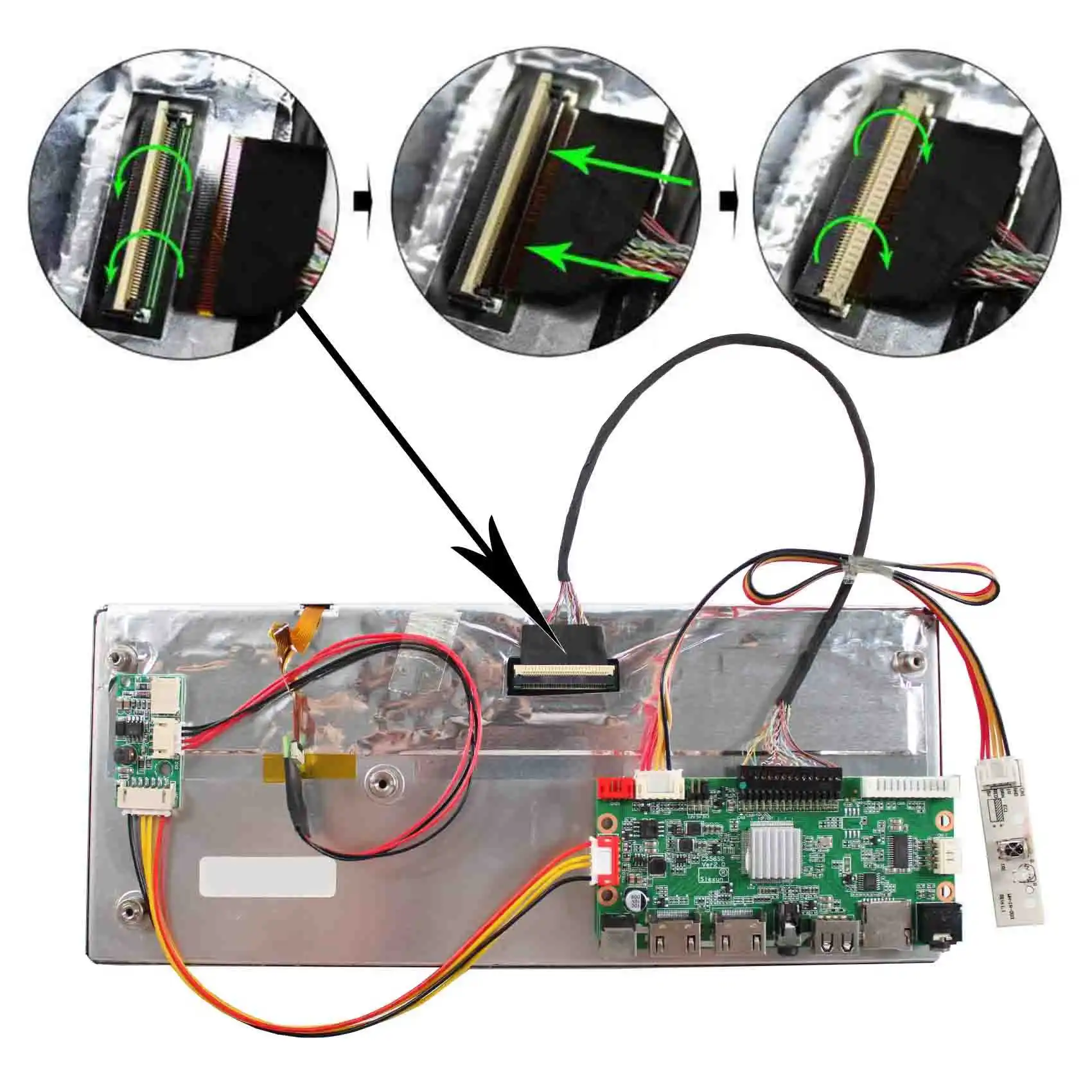 La carte contrôleur LCD dispose d’une interface de signal LVDS avec 2 canaux et 8 bits, ainsi qu’un connecteur de 50 broches. Le rétroéclairage est assuré par des LED WLED. La tension d’entrée est de 3.3V (typique).