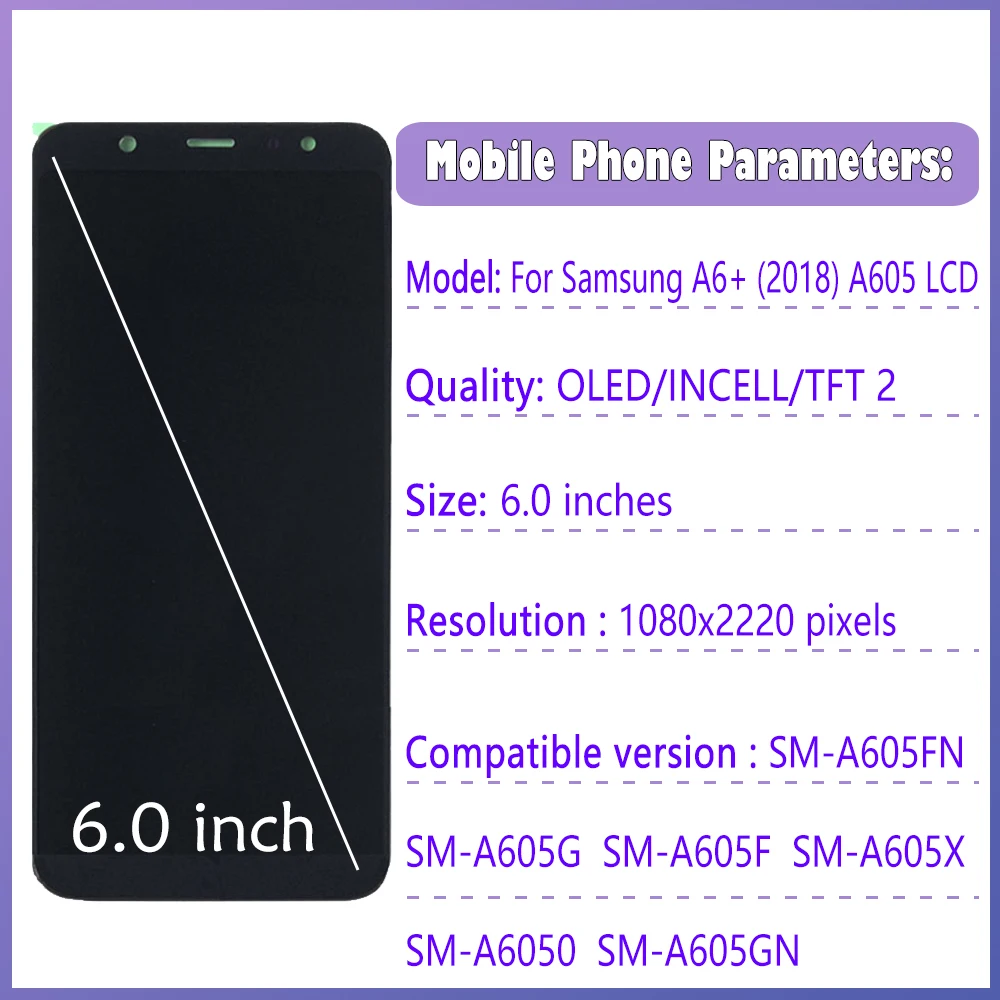 | Modèles compatibles | Pour Samsung A6 + A605 |