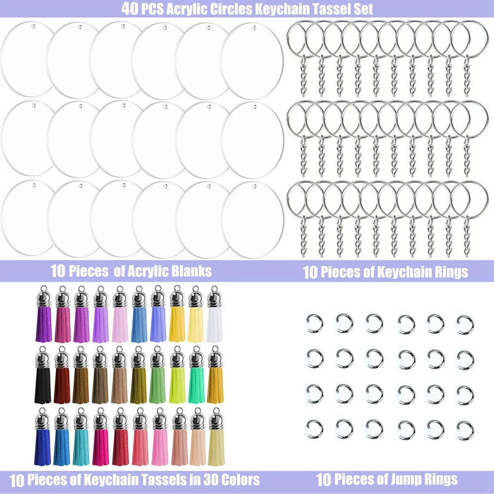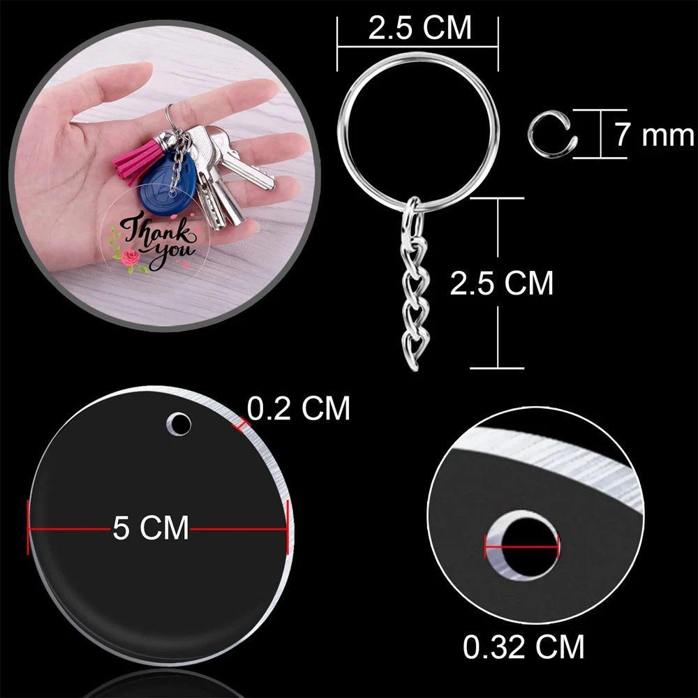 L’ensemble comprend 10 pièces de ronds en acrylique transparent de 2 pouces de diamètre, 10 pendentifs en cuir de couleur, 10 porte-clés avec chaîne et 10 anneaux de saut.