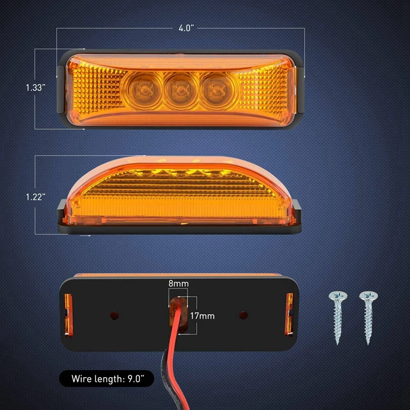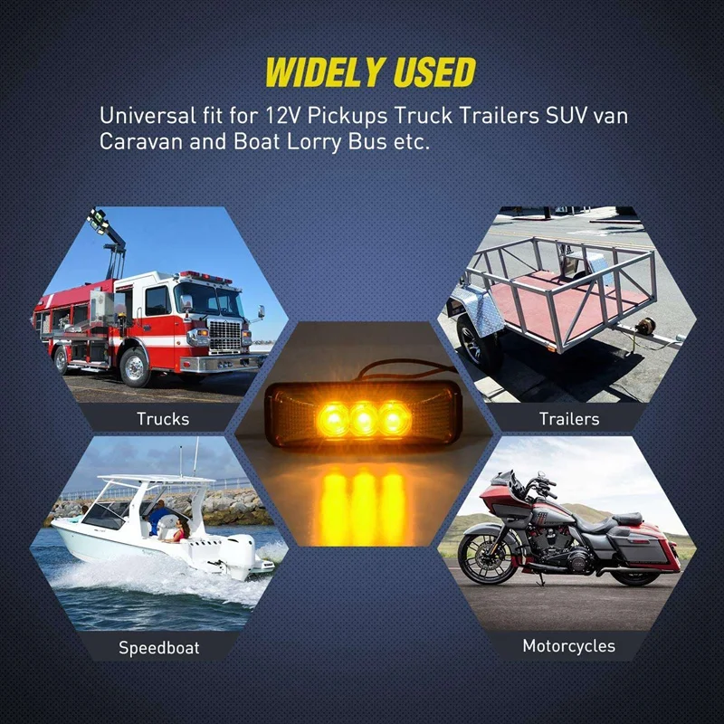 - Utilisé comme feu de position à l’avant arrière sur le toit latéral ou comme voyant lumineux de dégagement sur n’importe quel camion camionnettes 12V remorques SUV RV van caravane camping-car bateau camion bus etc.
