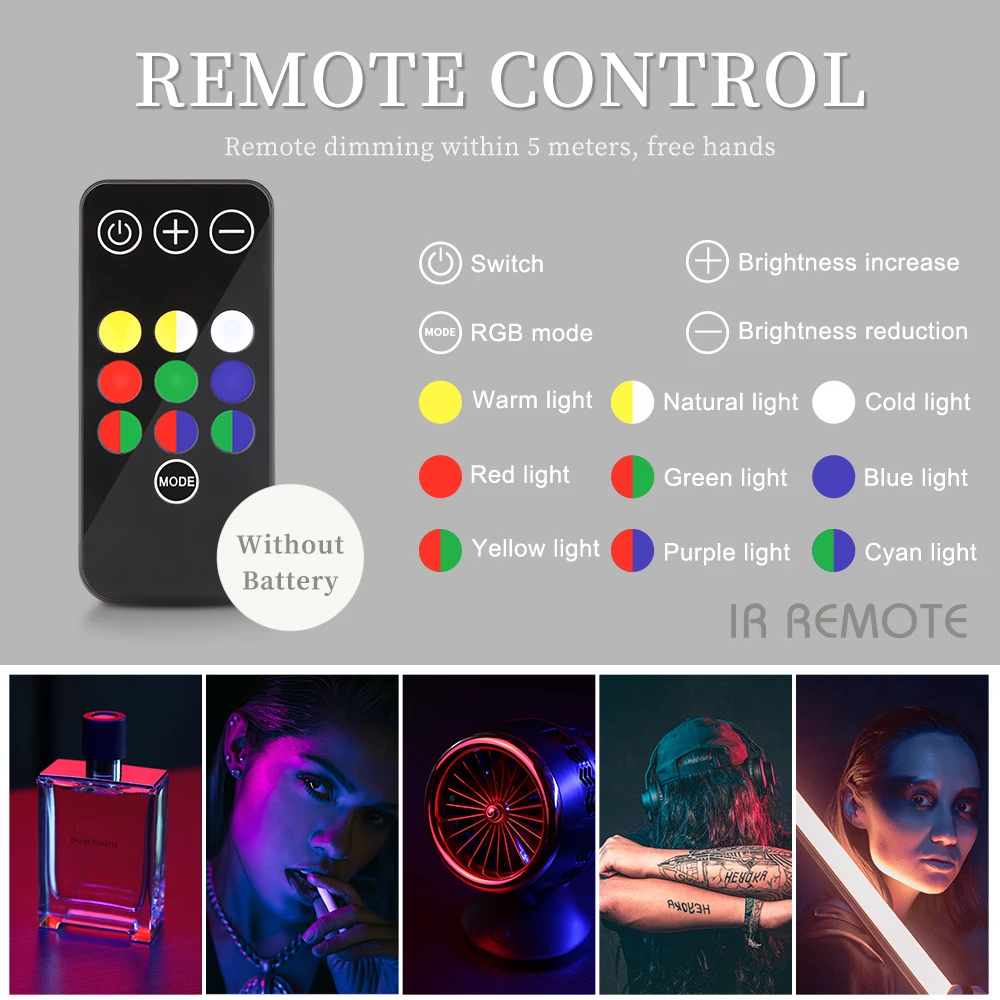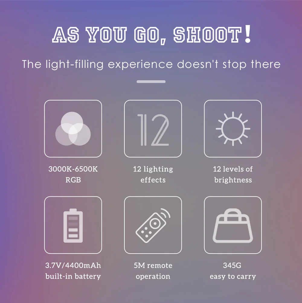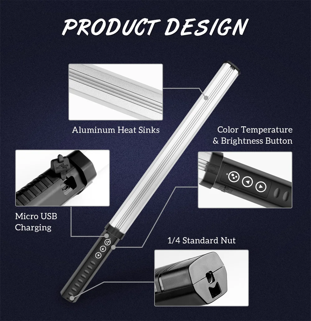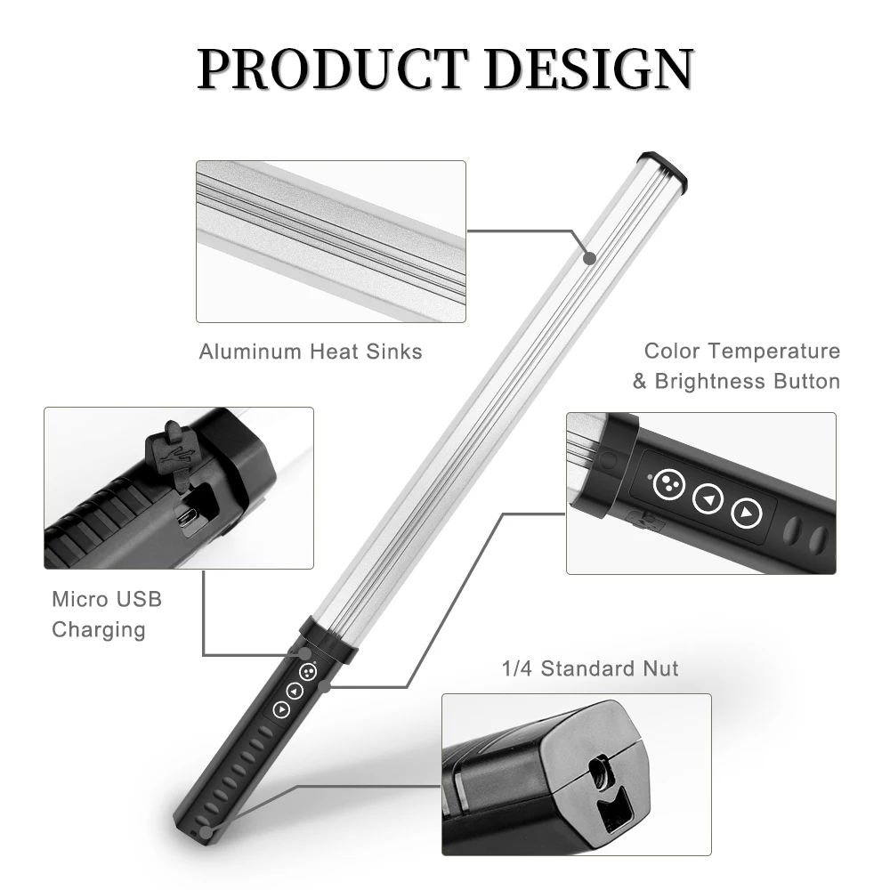 | Caractéristiques du produit | Effets d’éclairage: 12 types d’effets d’éclairage peuvent être commutés à volonté, et l’indice de rendu des couleurs est supérieur ou égal à 95 Niveau de luminosité: 12 niveaux de luminosité peuvent être ajustés à volonté, adaptés à la lumière d’appoint dans différentes scènes Télécommande: à moins de 5 mètres, prend en charge la télécommande du bâton lumineux Fond: conception d’écrou 1/4 en bas, adapté au PTZ et au trépied Endurance: 32 heures à la luminosité la plus faible, faible consommation d’énergie et protection de l’environnement en mode haute luminosité |