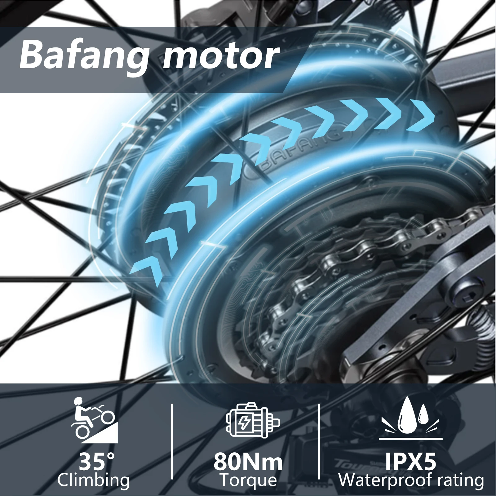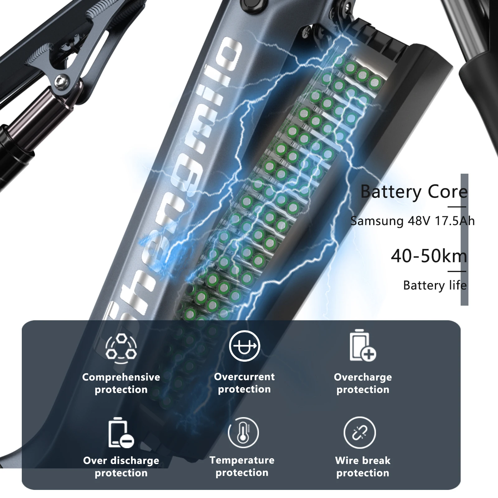 La roue arrière du vélo est équipée d’un puissant moteur Bafang de 1000W, offrant un couple jusqu’à 80N.m et une capacité d’escalade de 35°. La batterie au lithium-ION de 48V17.5Ah importée de Samsung permet une autonomie élevée.