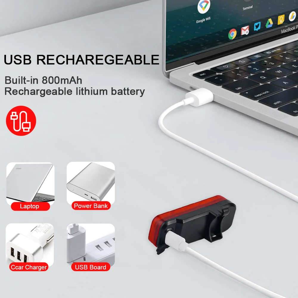 Le feu arrière de vélo se recharge facilement grâce à un câble USB. Vous pouvez le brancher sur un ordinateur, un chargeur ou une batterie portable, ce qui vous permet de le recharger à tout moment et n’importe où. Fini les piles jetables, vous faites un geste pour l’environnement en optant pour ce modèle rechargeable.