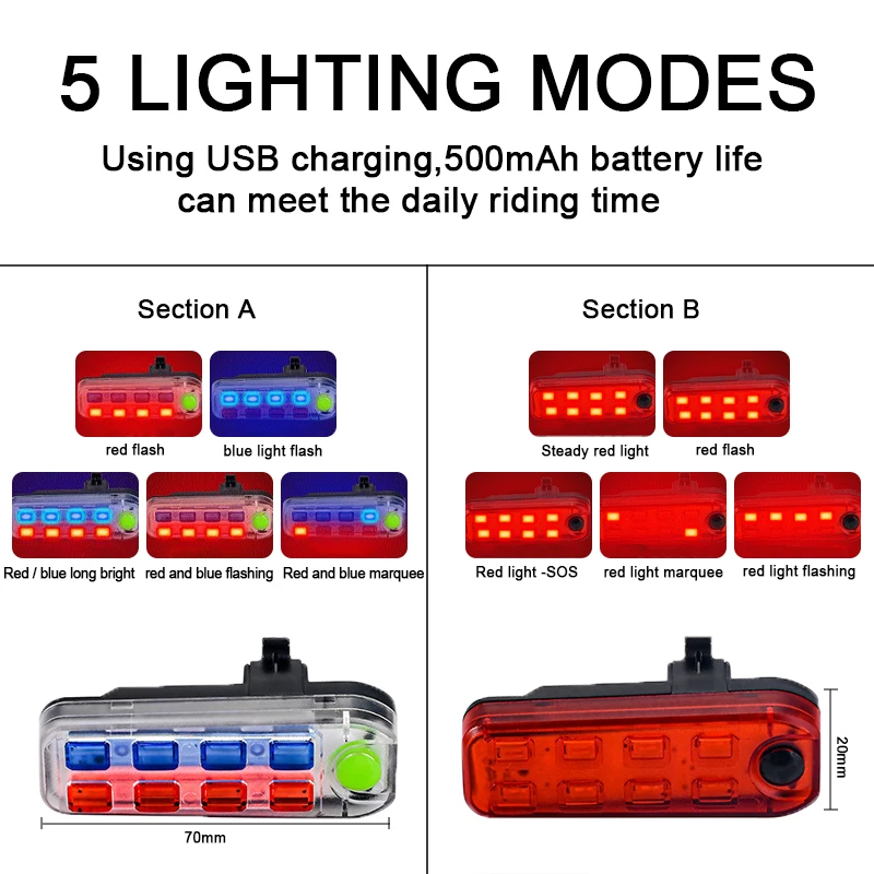 Ce feu arrière propose 5 modes différents pour s’adapter à toutes les conditions météorologiques et tous les terrains. Vous pouvez choisir entre le mode normal, le mode flash, le mode SOS, le mode lumière continue et le mode flash sautillant. Ainsi, que vous couriez, promeniez votre chien, fassiez du vélo, du skateboard ou de la randonnée, ces lumières de sécurité vous assurent une grande visibilité.