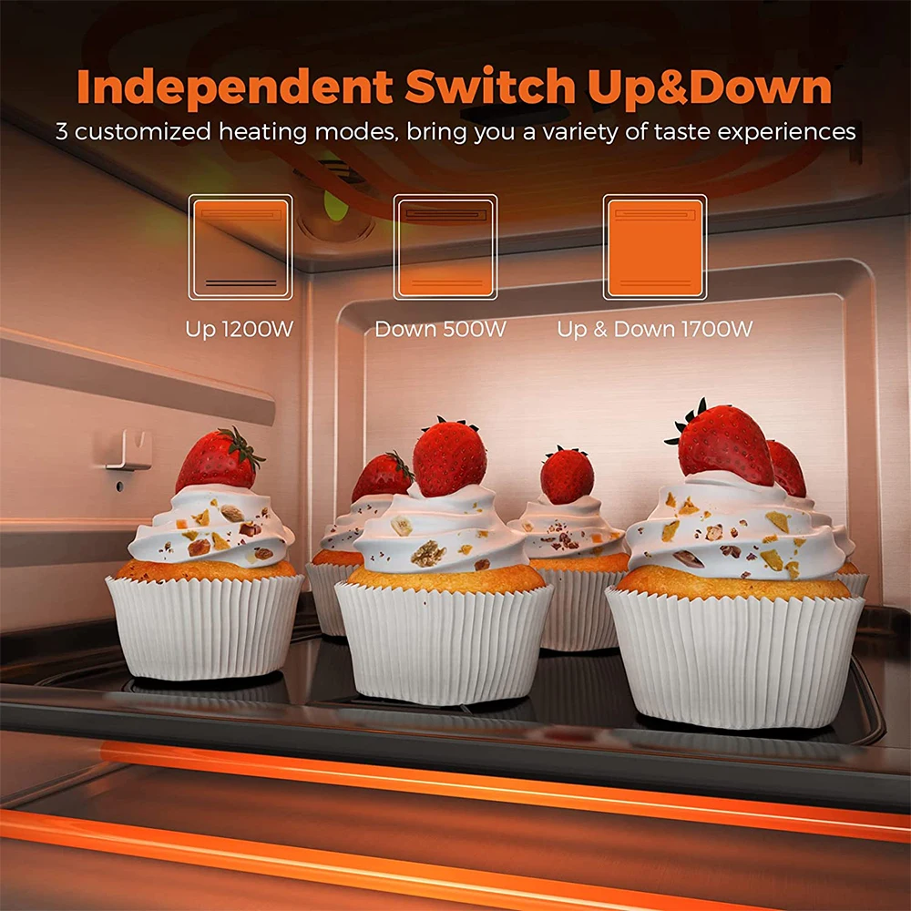 Les éléments chauffants haut et bas combinés à une circulation d’air chaud à 360 ° permettent d’atteindre une température de 220 ℃, qui permet de cuisiner des repas familiaux savoureux en coupant 30% le temps de cuisson et de rendre les ingrédients uniformément avec un croquant juteux. Le meilleur pour les ménages occupés en déplacement! De plus, les éléments chauffants Up & Down peuvent être des interrupteurs indépendants. 3 modes de chauffage personnalisés, ce four de comptoir de friteuse à air vous apporte diverses expériences gustatives.