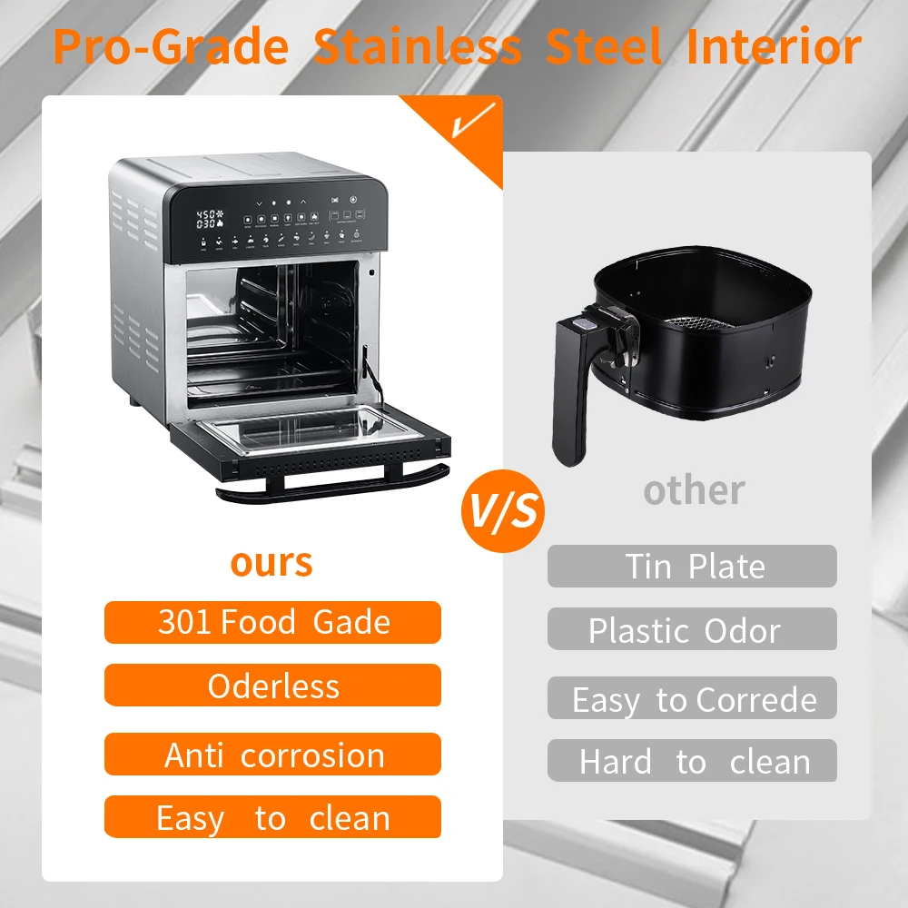 L’intérieur de la friteuse à air BioloMix est fabriqué en acier inoxydable de qualité alimentaire 304 au lieu d’étamage, ce qui garantit la sécurité alimentaire et l’absence d’odeur. Sans BPA, facile à nettoyer et anti-corrosion. La construction durable résiste à tout ce que la vie apporte. Le four de taille familiale de 15L est facile à préparer un gros repas pour un maximum de 8 personnes. La conception à 3 niveaux séparés permet de faire frire le plat principal et le plat d’accompagnement en même temps.