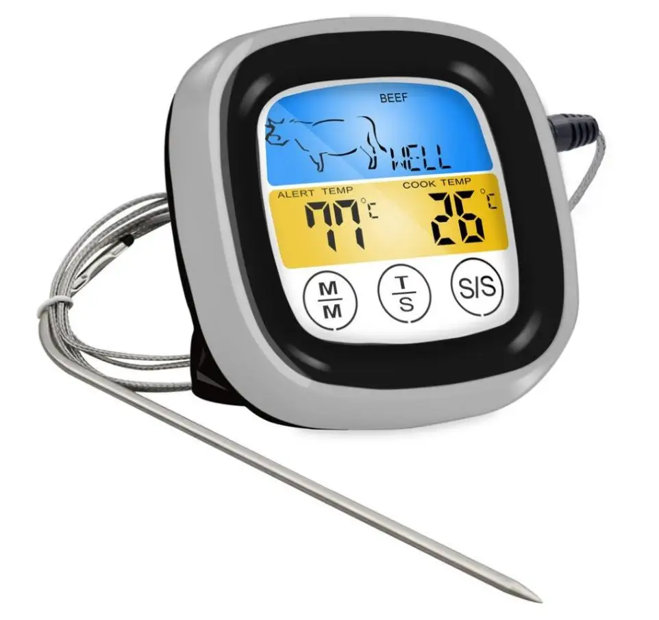 Le Thermomètre numérique à écran tactile LCD est un thermomètre alimentaire avec 2 sondes de température conçu spécialement pour la cuisson des grillades. Ce thermomètre électronique multifonction peut être utilisé pour mesurer la température des aliments ainsi que pour régler une minuterie pour un temps de cuisson précis. Il peut mesurer la température des aliments dans une plage de -10°C à 250°C (12°F à 482°F) et peut fonctionner jusqu’à 99 minutes et 59 secondes. Avec son grand écran couleur et sa conception de mesure précise, ce thermomètre est facile à lire et à utiliser.
