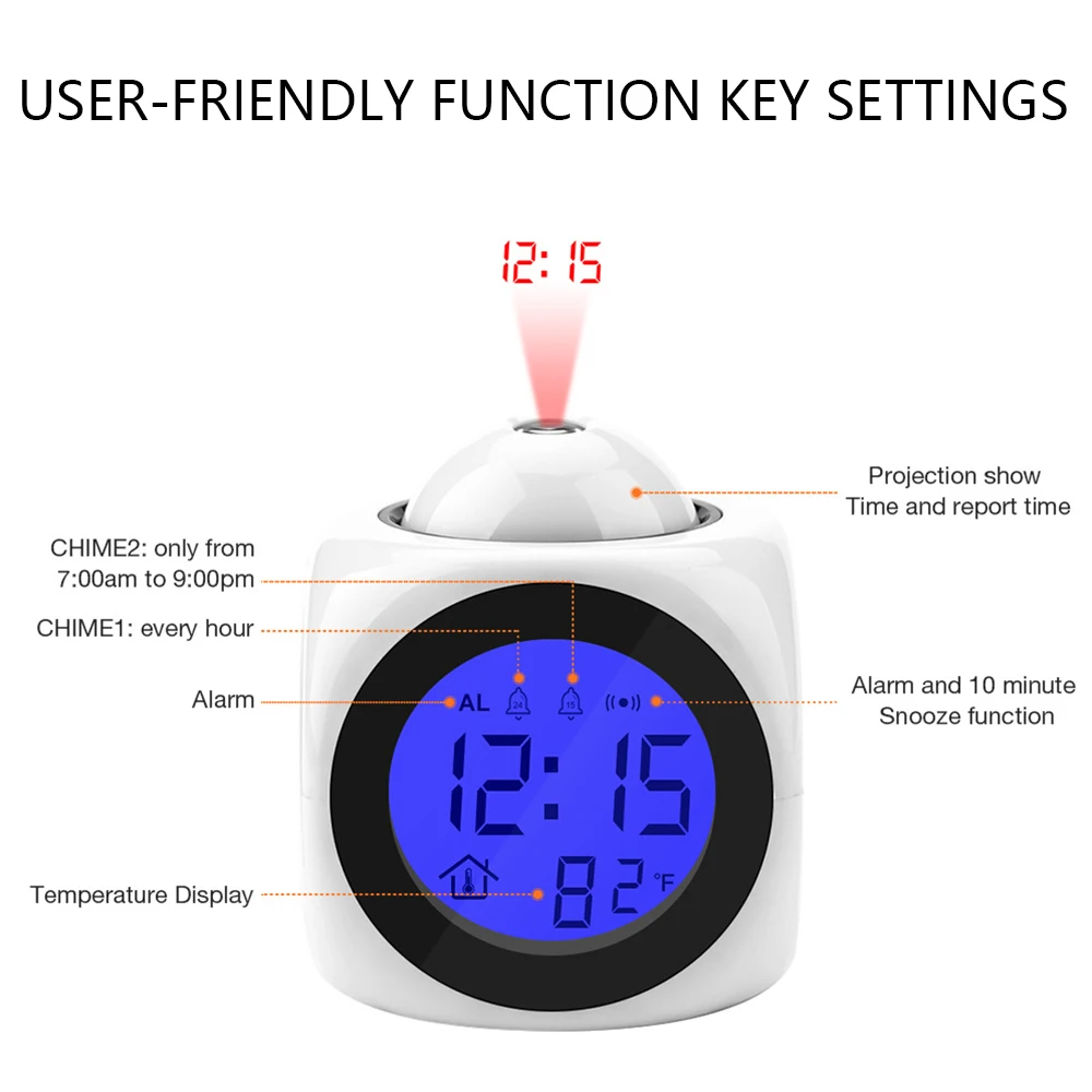 Le réveil à projection King affiche l’heure, la température et possède une fonction vocale.
