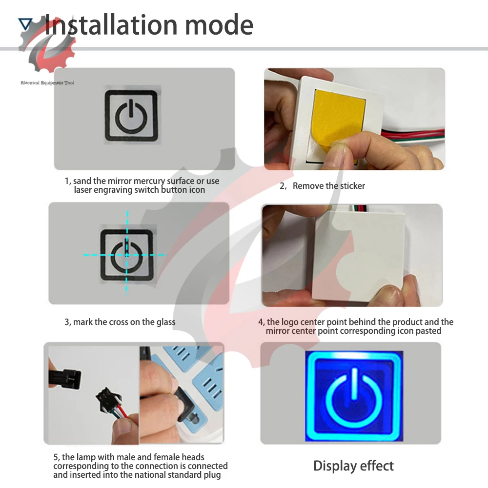 - Après l’installation de l’interrupteur, les accessoires de l’interrupteur ne sont pas visibles à l’avant du miroir, mais le signe tactile affiché sur le rétroéclairage peut être vu.