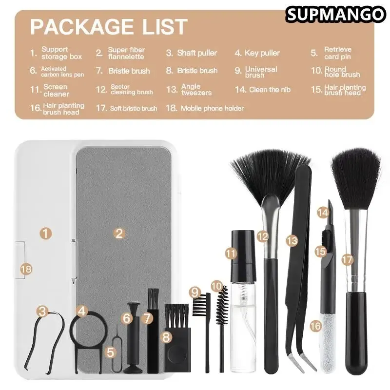Le kit de nettoyage multifonctionnel 18in1 pour votre maison répond aux besoins de nettoyage de presque tous les produits de votre maison! C’est votre petit aide domestique!! Téléphones portables, tablettes, ordinateurs, téléviseurs, écouteurs, rasoirs, appareils photo, caméras vidéo, consoles de jeux, claviers, etc. !! Conception de stockage intégrée, conception pratique, mais aussi support de téléphone portable!