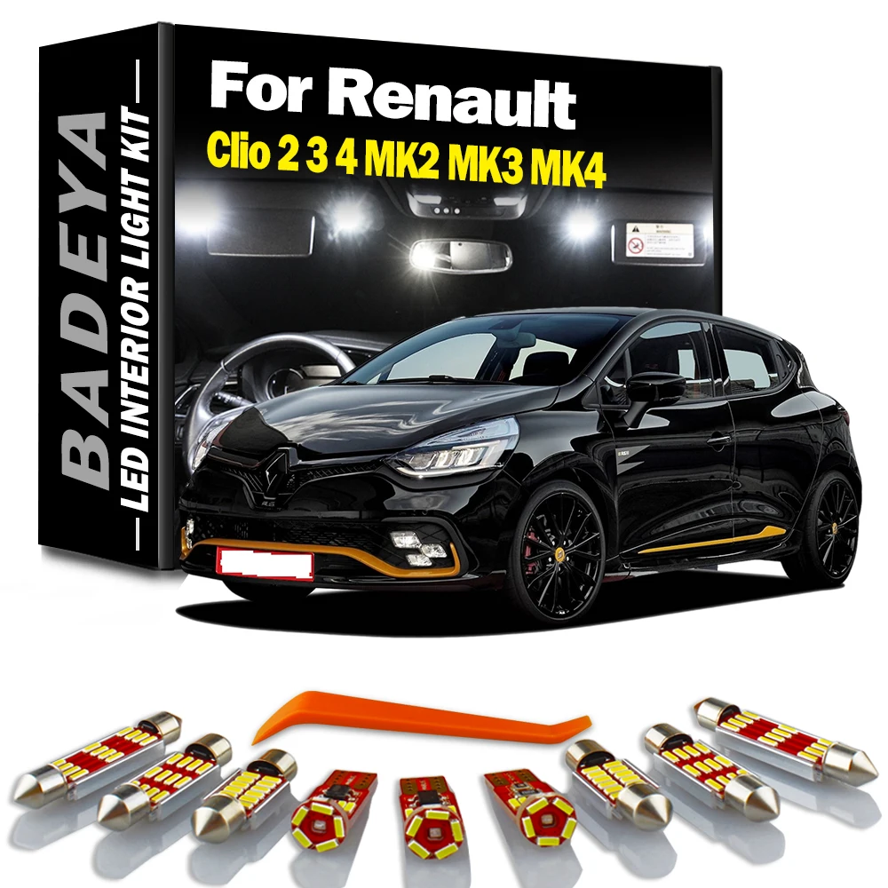 Les ampoules de lecture Canbus White Brave Free de BADEYA sont spécialement conçues pour les voitures Renault Clio 2, 3, 4, II, III, IV, MK2, MK3, MK4 (1998-2017). Elles offrent un éclairage intérieur puissant et de qualité. Voici le contenu du kit pour chaque modèle :