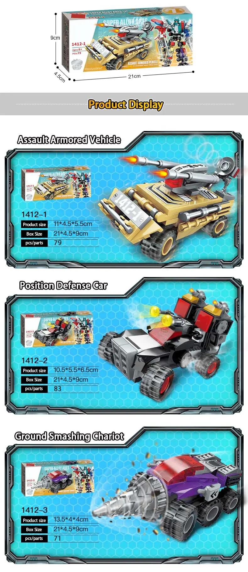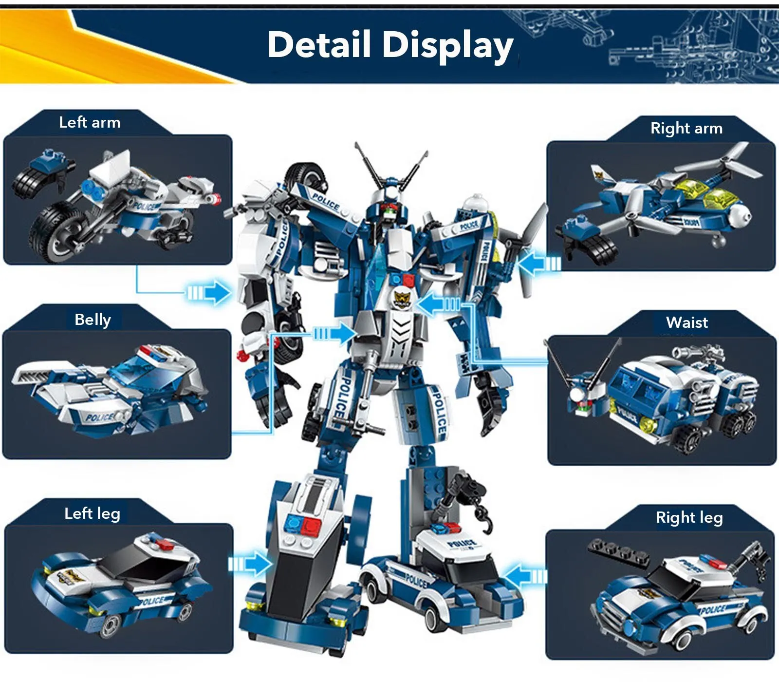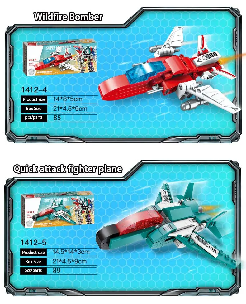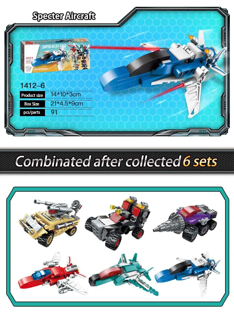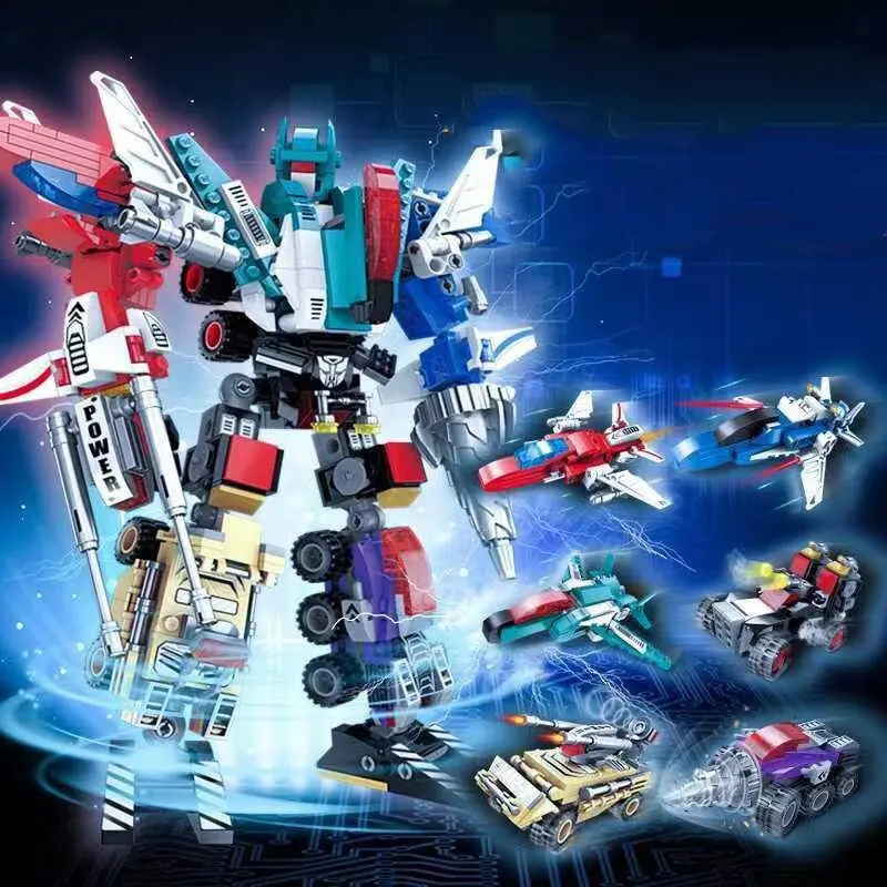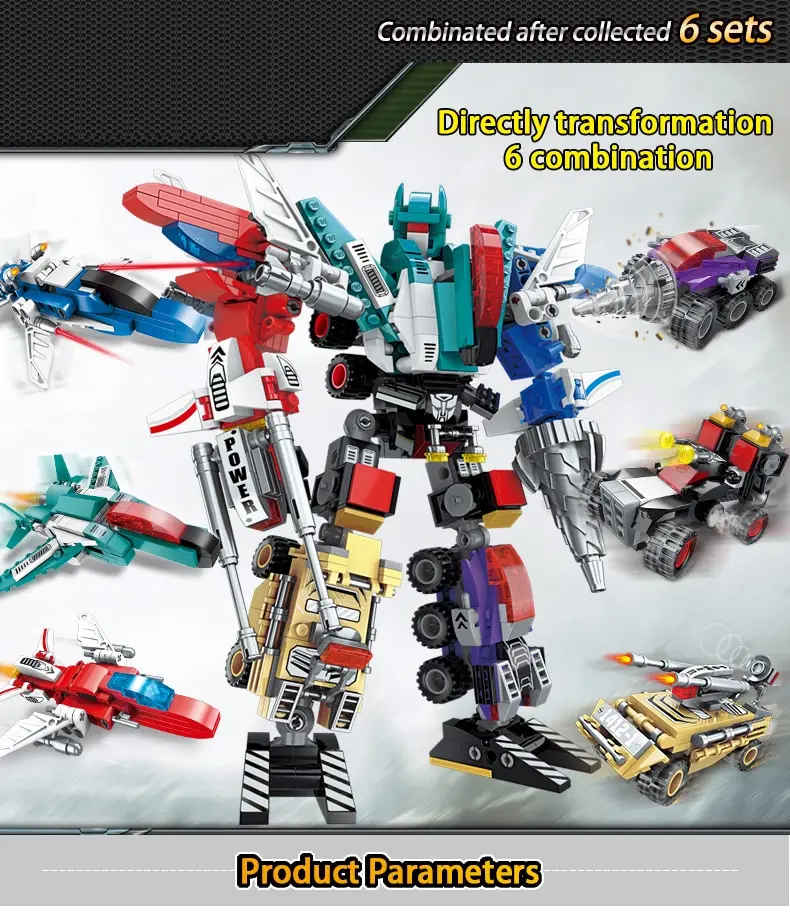 Chaque ensemble de robot peut être assemblé dans un grand robot ou 6 modèles de véhicules! Chaque blocs de construction ensembles peuvent être construits dans un total de 7 modèles, votre enfant peut choisir de construire 6 petits blocs différents, ou un gros blocs. Remarque: petits modèles et grands modèles ne peuvent pas exister en même temps.