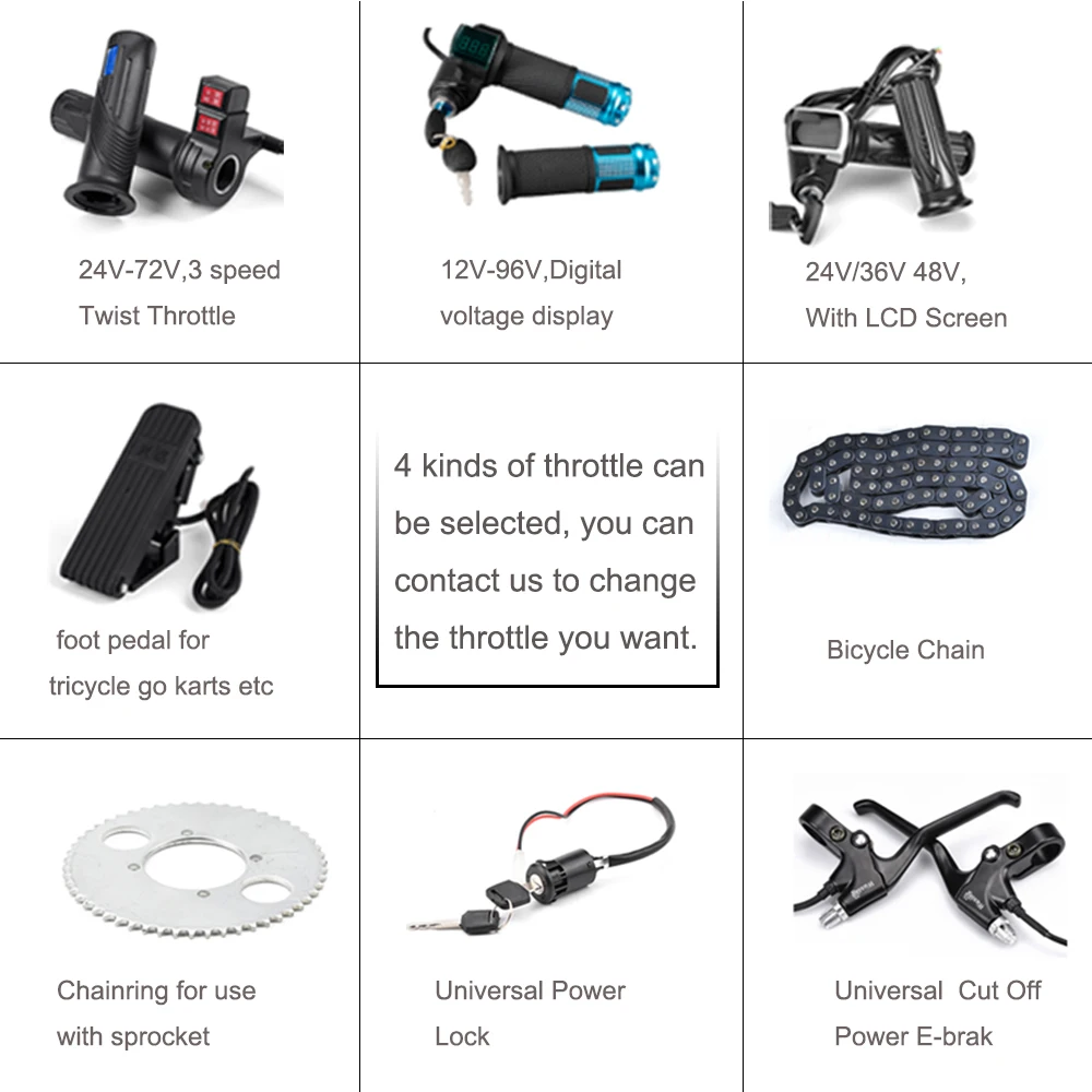 Cet ensemble de motorisation comprend 1 moteur, 1 contrôleur, 1 accélérateur, 1 chaîne, 1 plateau, 1 allumage et 1 serrure (frein).