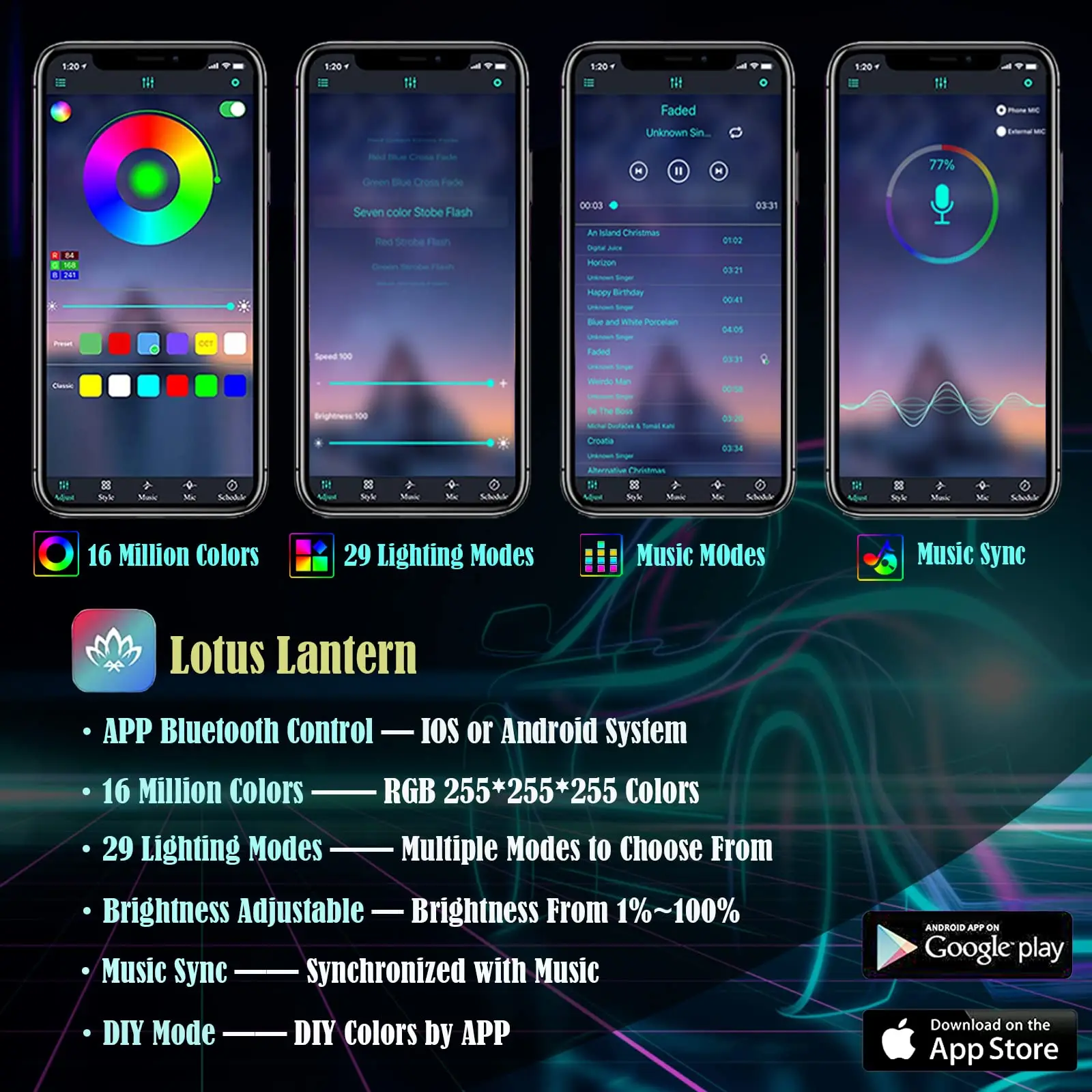 Avec le contrôle bluetooth sans fil APP, vous pouvez choisir parmi 16 millions de couleurs différentes et 29 modes d’éclairage pour créer l’atmosphère parfaite dans votre voiture. Que vous souhaitiez une ambiance sourde et relaxante ou une atmosphère vibrante et festif, ce kit d’éclairage intérieur LED peut s’adapter à toutes vos préférences.