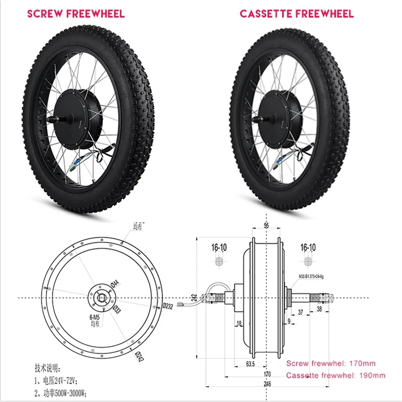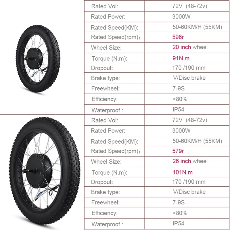 Fat Bike roue électrique 72V 3000W roues de vélo de neige 20in 26in Hub Motor Bike ebike Kit de Conversion roue arrière avec pneu 63-70 km/h