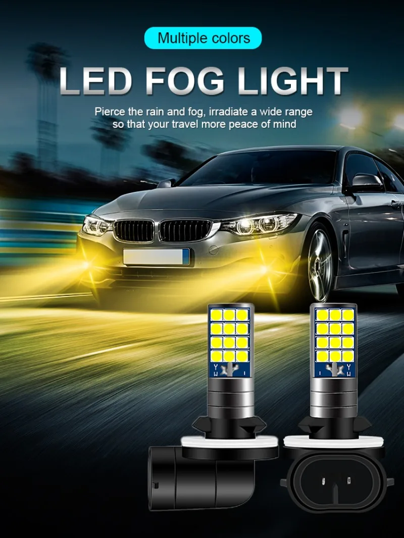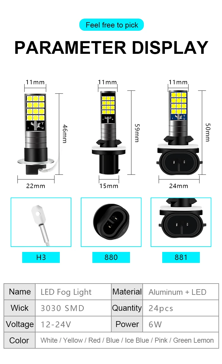 Ampoule de phares antibrouillard multicolore H1 H3 H27 881 3030 24SMD 2400LM Jaune Rose Vert Bleu Lampe de course pour voiture Auto Leds Light 12V