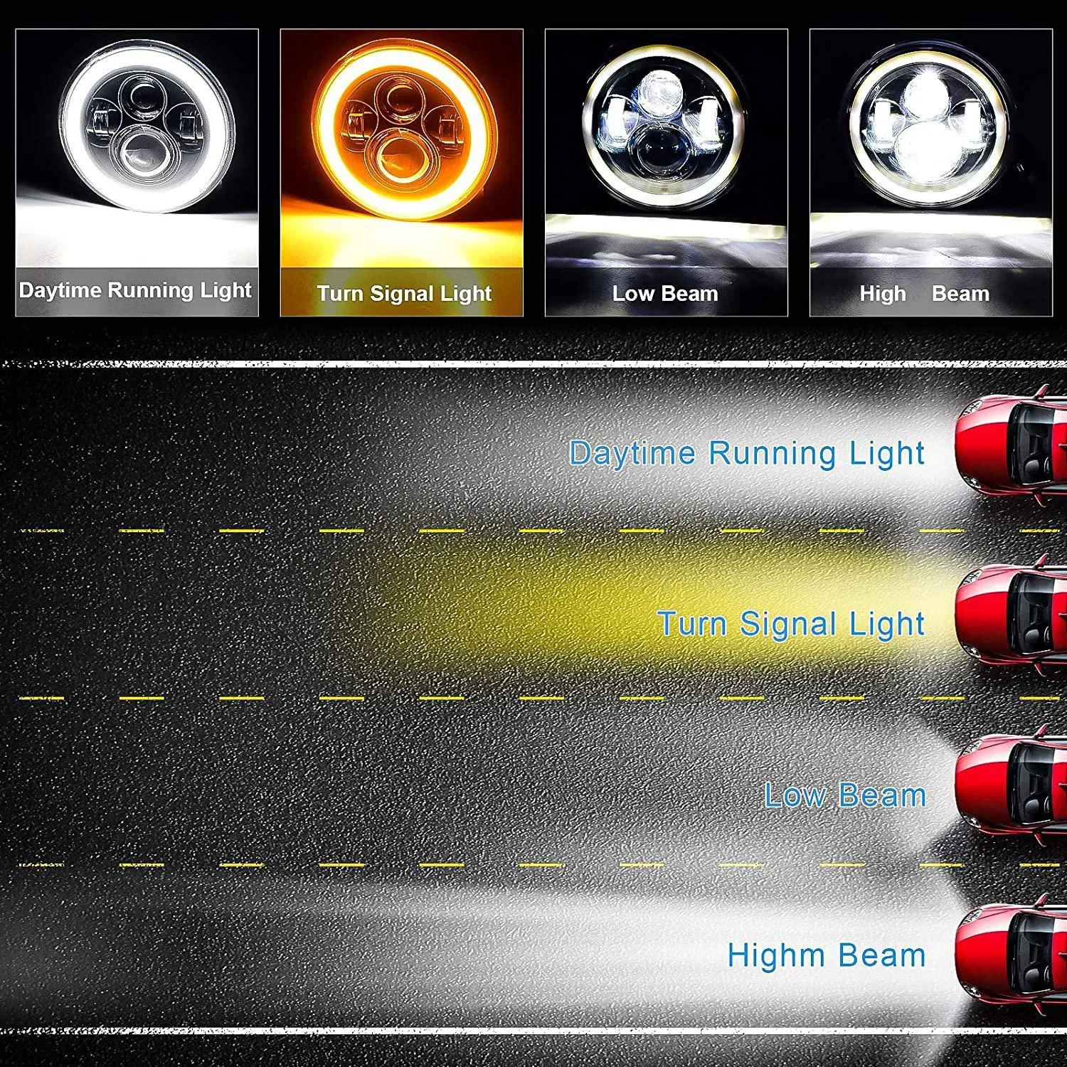 De plus, cette lampe LED offre quatre modes d’éclairage différents pour s’adapter à toutes les situations: feux diurnes, clignotants, feux de route et feux de croisement. Cela permet une utilisation polyvalente et efficace selon vos besoins.