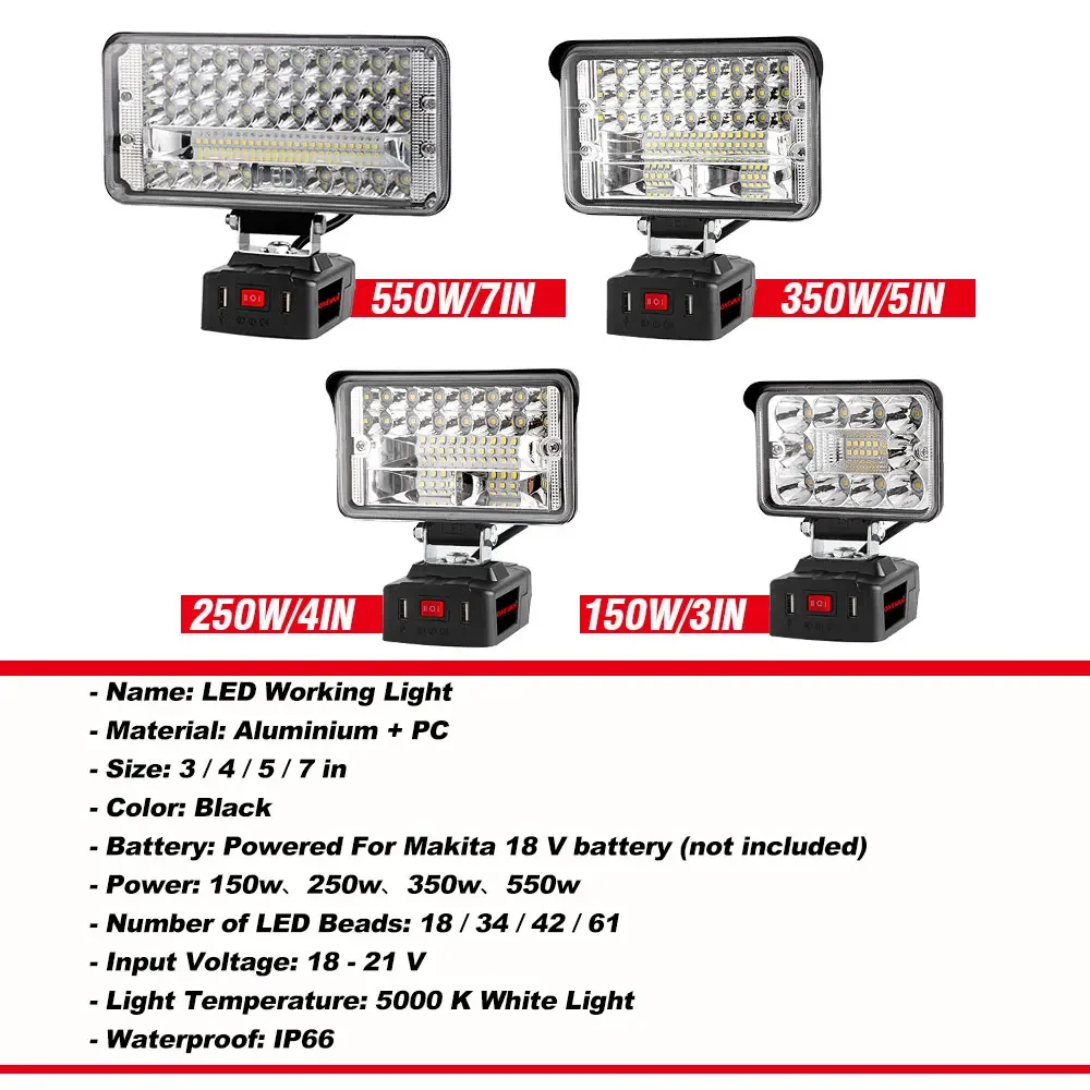 La lampe de travail électrique LED Onovan est un produit de qualité offrant une source de lumière stable et brillante grâce à ses perles LED de haute qualité. Sa puissance élevée équivalente à deux projecteurs ordinaires en fait un choix idéal pour différentes utilisations. La dissipation thermique efficace garantit la durée de vie du projecteur, tandis que l’abat-jour épaissi et renforcé ainsi que l’étanchéité IP 66 en font un choix fiable pour une utilisation en extérieur. La possibilité de tourner la lampe à un angle pratique ajoute à sa polyvalence. Avec différentes options de puissance et de nombre de perles LED, vous pouvez choisir la lampe qui correspond le mieux à vos besoins. Cependant, veuillez noter que la batterie Makita de