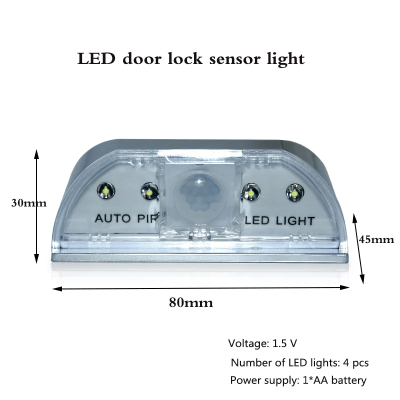 La Lampe de Verrouillage de Porte à LED est équipée de la technologie de détection infrarouge pour allumer automatiquement la lumière lorsque quelqu’un s’approche de la porte. Cette lampe est idéale pour les zones sombres où vous n’avez pas à tâtonner devant votre porte. Fabriquée en plastique de haute qualité, elle est durable et légère. Les dimensions de la lampe sont de 8 x 4 x 3 cm. Elle utilise 4 LED comme source de lumière. Le capteur infrarouge fonctionne dans un angle de 60 degrés et à une distance de 3 mètres. La lampe est équipée d’un capteur photosensible pour fonctionner la nuit et en mode veille le jour. Elle fonctionne avec une pile AA (non incluse) et peut être installée avec du ruban adhésif double face ou des vis. Elle peut être utilisée sur les portes, dans la cuisine, dans un coffre-fort, dans une armoire, dans les tiroirs, dans la boîte à gants de la voiture, etc.