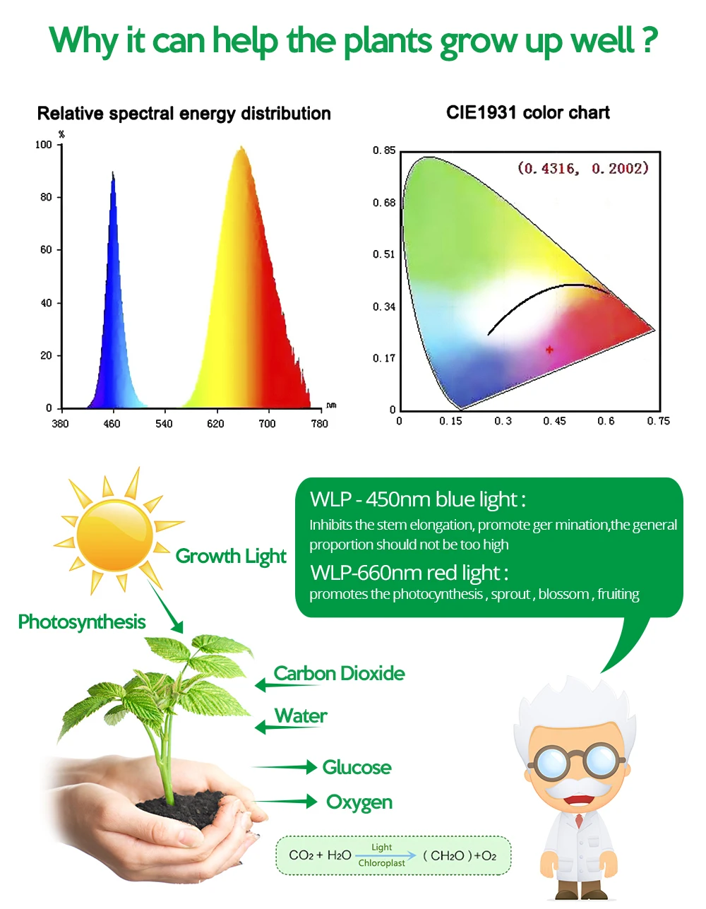 - -La couleur accélère la feuille, les plantes, les fleurs, les légumes poussent mieux, favorisant la floraison;