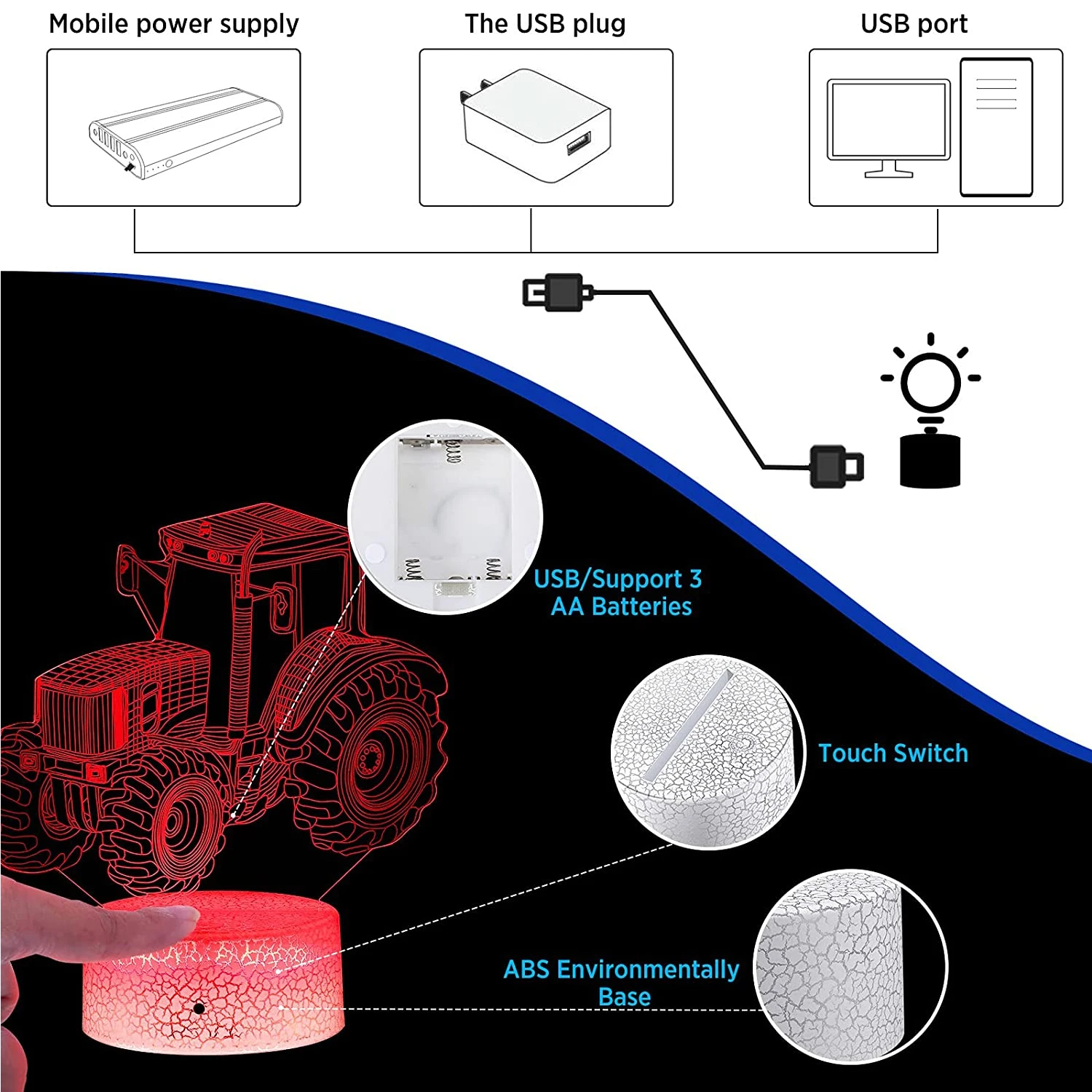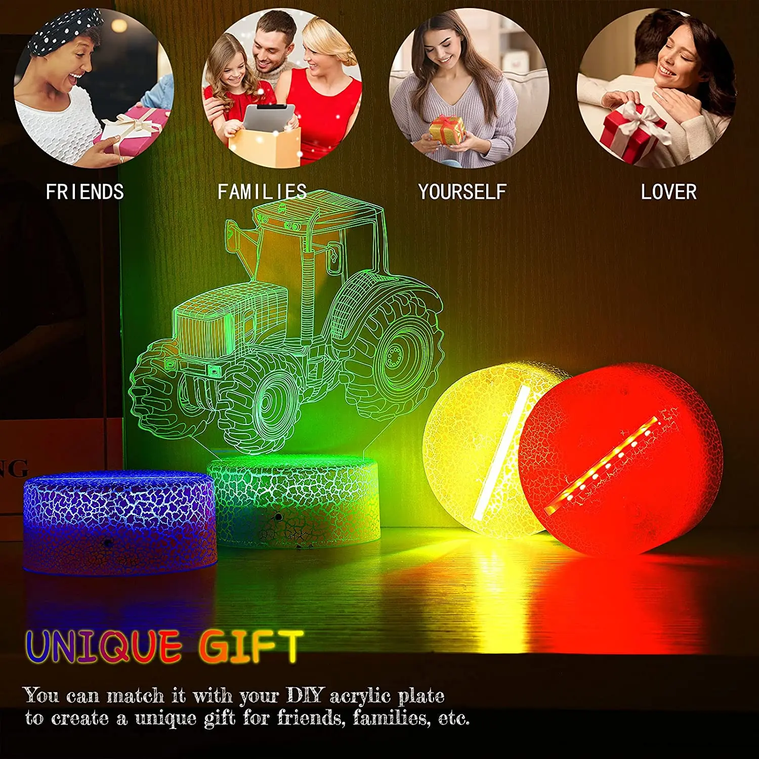 Cette lampe LED 3D peut être utilisée pour afficher des illustrations acryliques exquises ou comme veilleuse chic pour rendre une pièce chaleureuse et rêveuse. Elle convient aux chambres, chambres d’enfants, salons, bars, boutiques, cafés, restaurants, bureaux, etc.