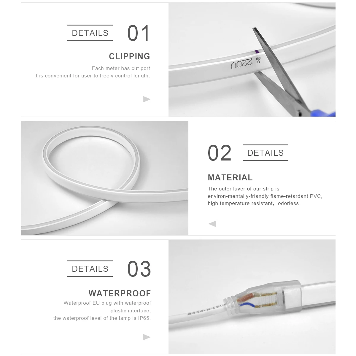 Le Neon Flex LED Light est disponible en longueurs de bande de 1M, 2M, 3M et 5M.