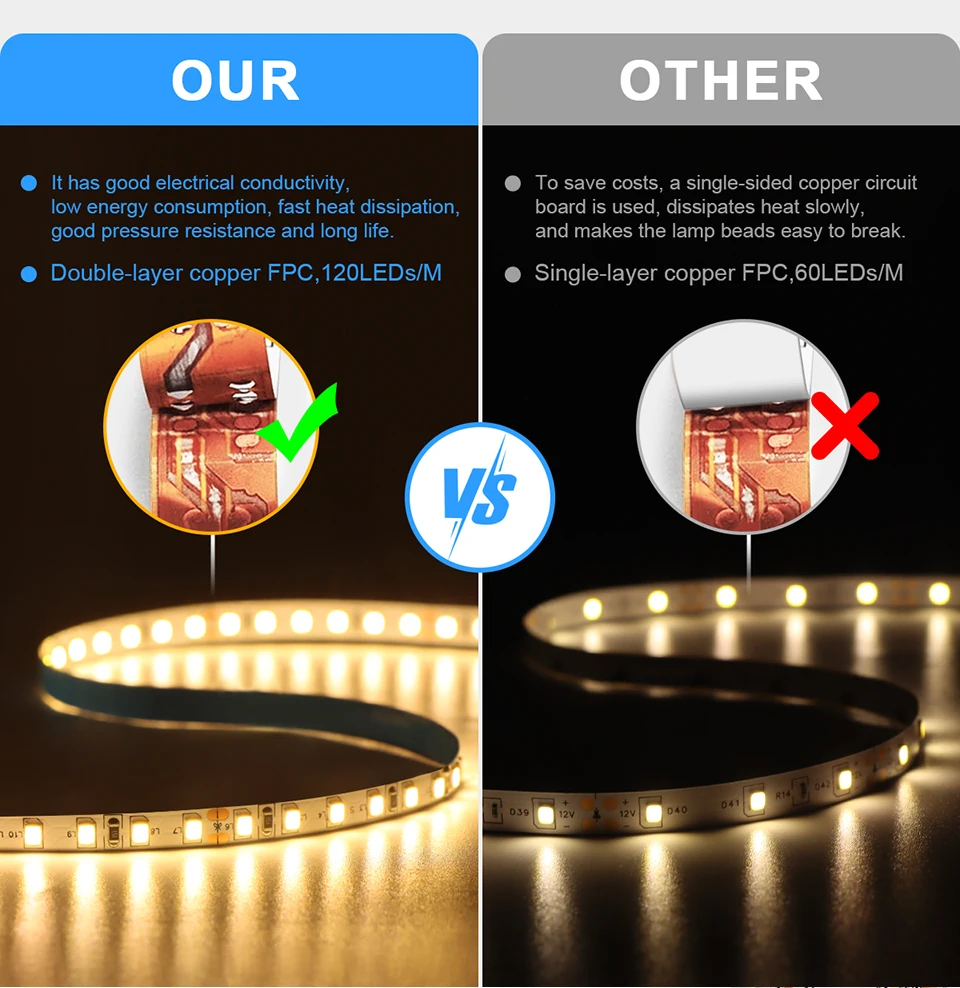 La lampe d’armoire à LED haute luminosité est une bande lumineuse d’armoire avec une double couche de cuivre de 5mm. Elle dispose d’un port de câble métallique DuPont pour faciliter le branchement. Fonctionnant sous une tension de 12V, cette bande est équipée de 120 leds par mètre. Elle est disponible en différentes longueurs, allant de 1 à 5 mètres. Elle est idéale pour la décoration des contours du bâtiment, l’illumination du paysage, les thèmes d’amusement, la sculpture légère de vacances et les figures décoratives.