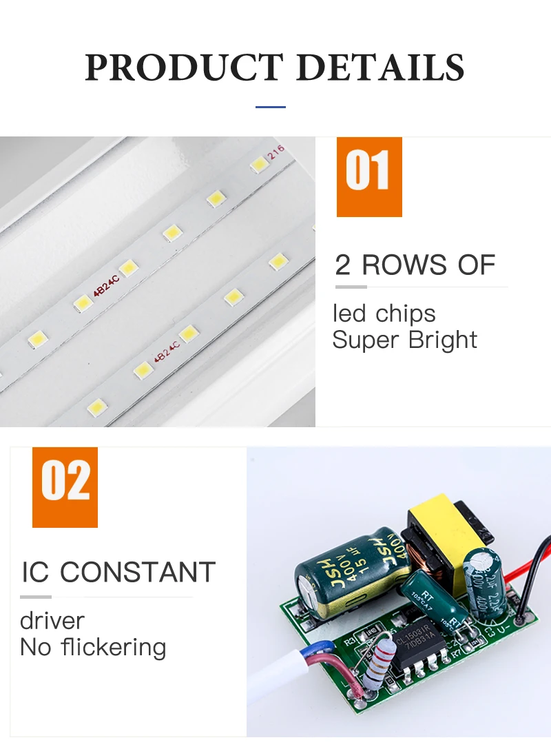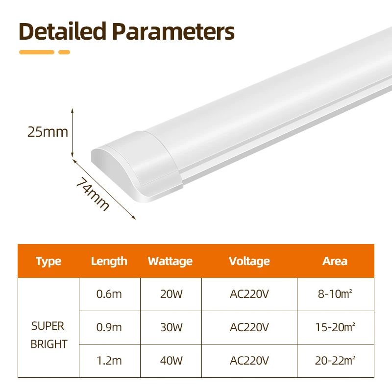 La lampe à tube LED super lumineuse est idéale pour éclairer les armoires de cuisine, les maisons et les usines. Elle est disponible en trois tailles : 60 cm, 90 cm et 120 cm. Avec une puissance de 20W, 30W ou 40W, elle offre un flux lumineux allant de 1508lm à 2599lm. La lampe est équipée de 96, 144 ou 192 perles de lampe de modèle 2835. Elle fonctionne avec une tension d’utilisation de AC 220V et dispose d’un entraînement à courant constant sans scintillement. La couleur de la lumière est blanche froide.