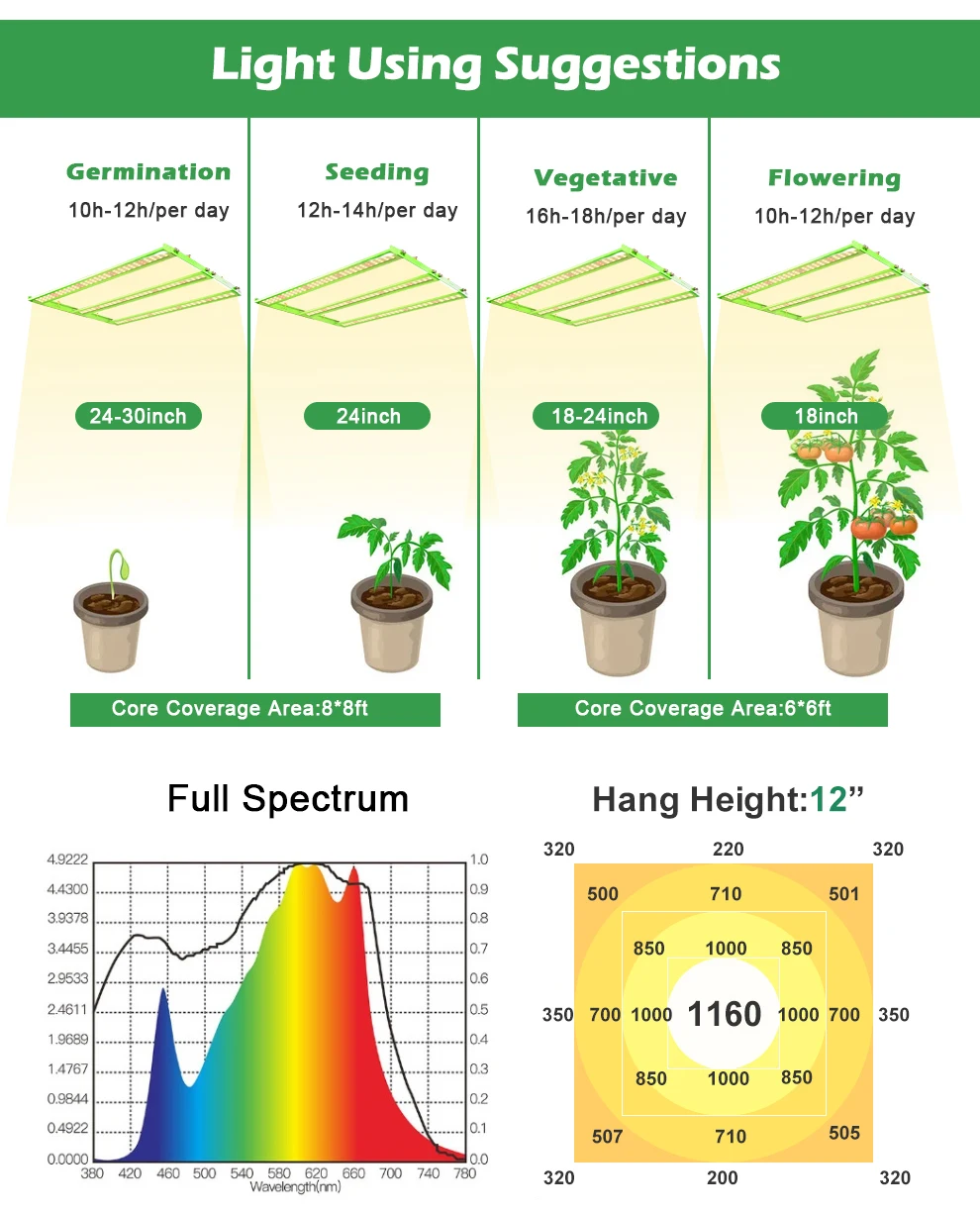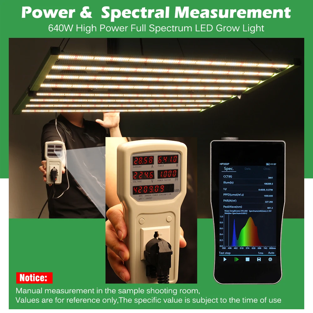 Les spécifications techniques de la lampe comprennent une tension de fonctionnement de AC85-265V et une puissance variable de 50W à 640W. La température de couleur peut être ajustée entre une lumière blanche chaude (3000K) et une lumière blanche (5000K). De plus, elle émet également de la lumière rouge (660 nm), infrarouge (760 nm) et ultraviolette (380 nm) pour favoriser la synthèse de la chlorophylle et la photosynthèse des plantes.