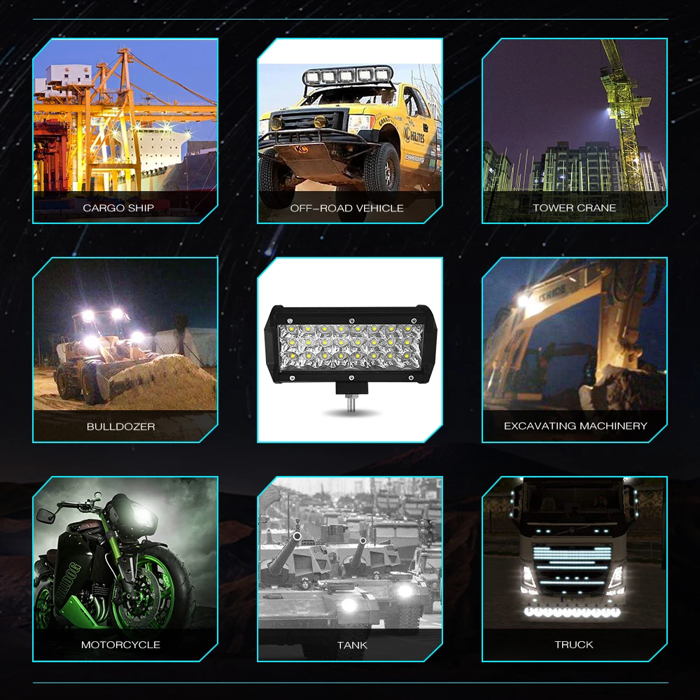La lampe de travail tout-terrain à rampe LED est un accessoire automobile très pratique et polyvalent. Disponible en différentes puissances (300W, 120W, 72W, 36W), elle est parfaite pour éclairer tout type de véhicule, que ce soit une voiture, une moto, un camion ou un bateau. Cette lampe est également adaptée pour une utilisation dans les travaux de construction, le jardinage, l’éclairage de cour arrière, etc.