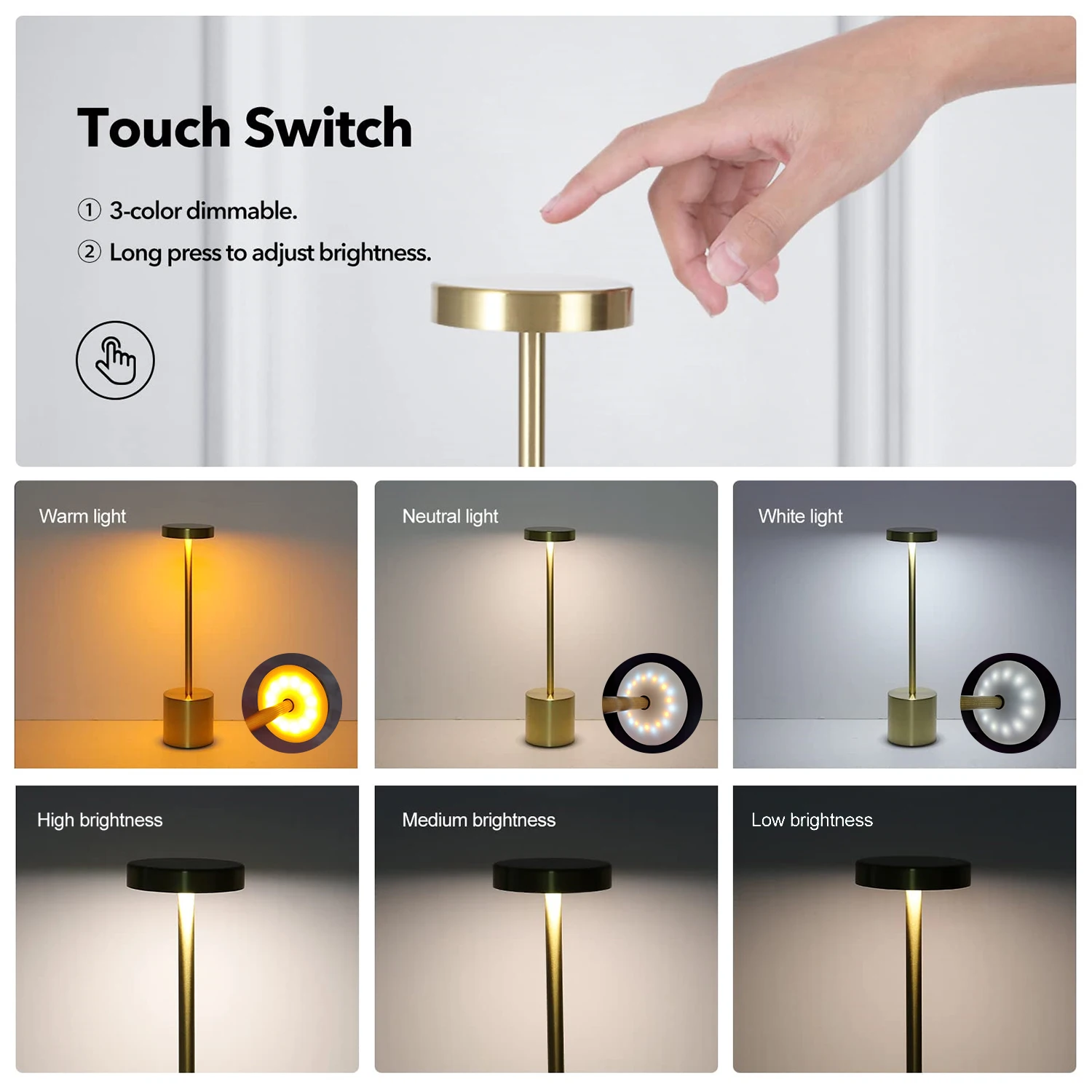 ✔️【Lampe de bureau tactile ajustable】Équipée d’un capteur tactile sensible sur le dessus de la petite lampe, vous pouvez ajuster la couleur ou la gradation. La lampe sans fil est conçue avec 3000K/ 4500K/ 6000K trois températures de couleur pour le choix, changez la couleur de la lumière en cliquant. Appuyez longuement pour régler la luminosité de 10% à 100%.
